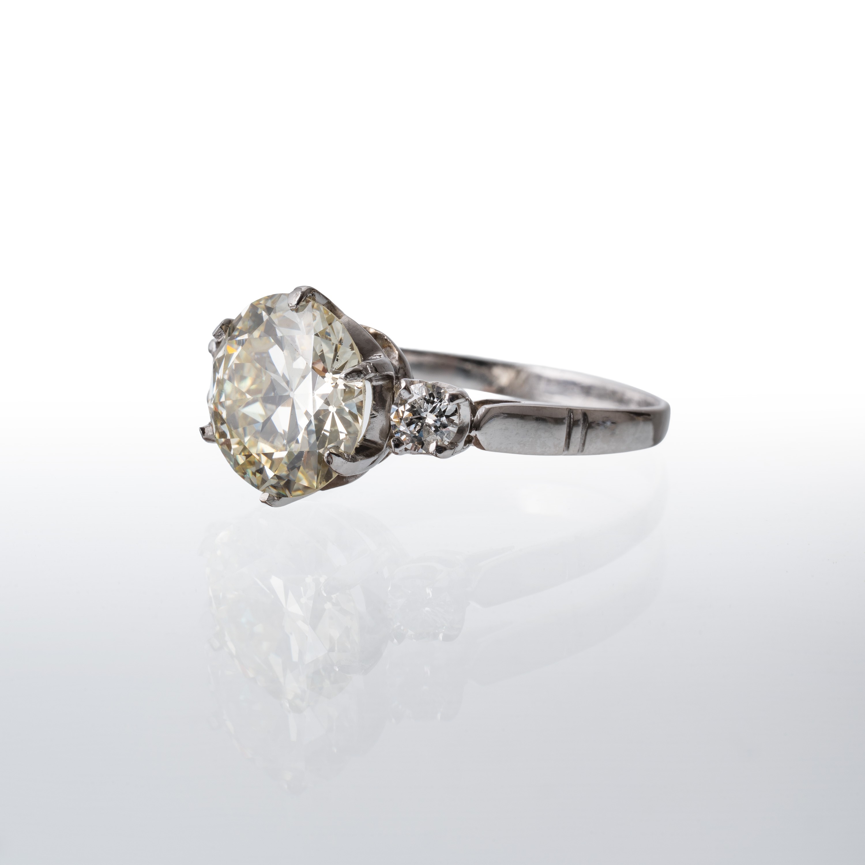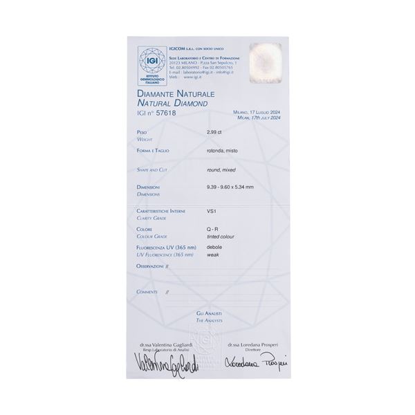 Anello in oro bianco 18 kt con diamante di 2,99 ct, colore Q-R, taglio rotondo, purezza VS1, dimensioni 9,39 - 9,60 X 5,34 mm, misura 56/16, peso 4,34 gr