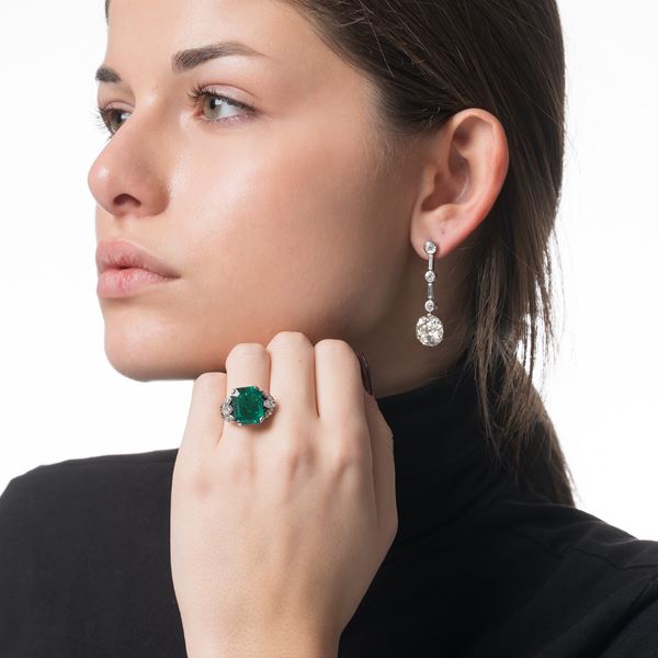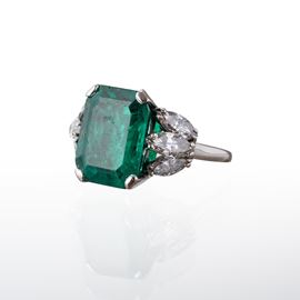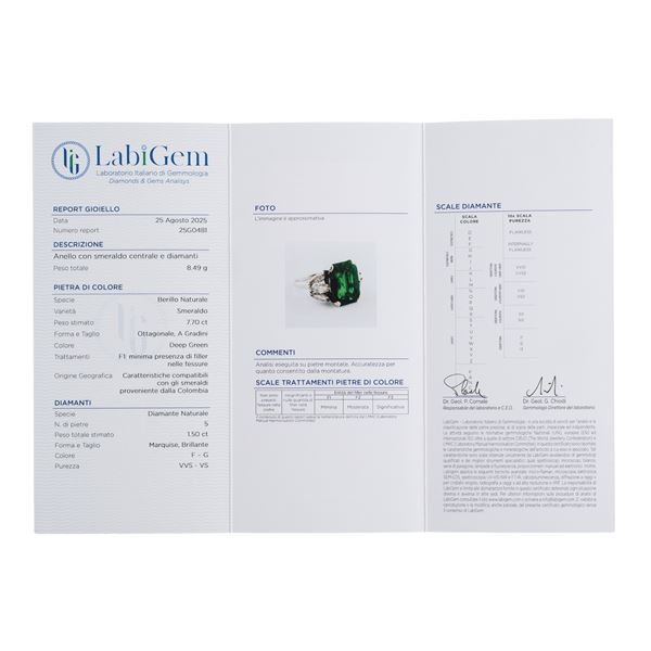 Anello in oro bianco 18 kt con smeraldo centrale Colombia di 7,70 ct, colore Deep Green, forma ottagonale, taglio a gradini e diamanti, colore F-G, forma marquise, taglio brillante purezza VVS-VS, misura 51/11, peso 8.49 gr