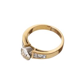 Anello in oro giallo 18 kt e diamanti. Diamante centrale di 0,90 ct circa taglio Vecchia Europa, colore stimato J/K VS, sei diamanti laterali di 0,30 ct totali stimati, taglio baguette, colore H/G VS