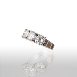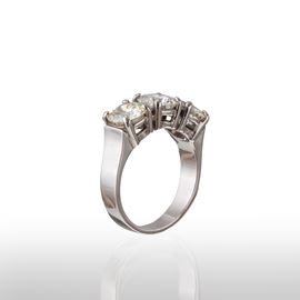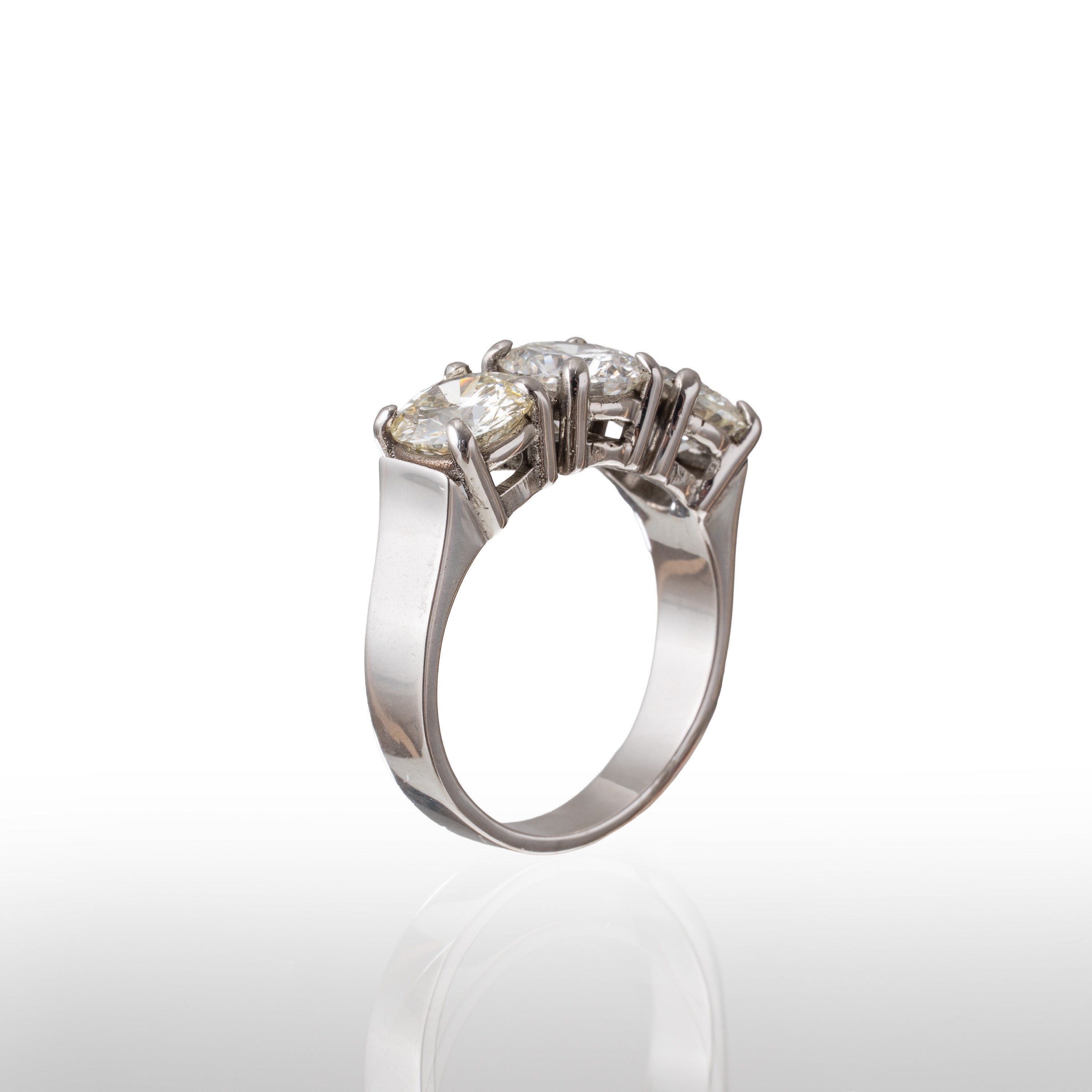 Anello in oro bianco 18 kt con tre diamanti taglio brillante, uno da 1,21 ct, colore J-VS, uno da 1,25 ct, colore H-VS, uno da 1,17 ct, colore M, purezza SI per totali 3,63 ct, misura 55/15, peso 7,76 gr