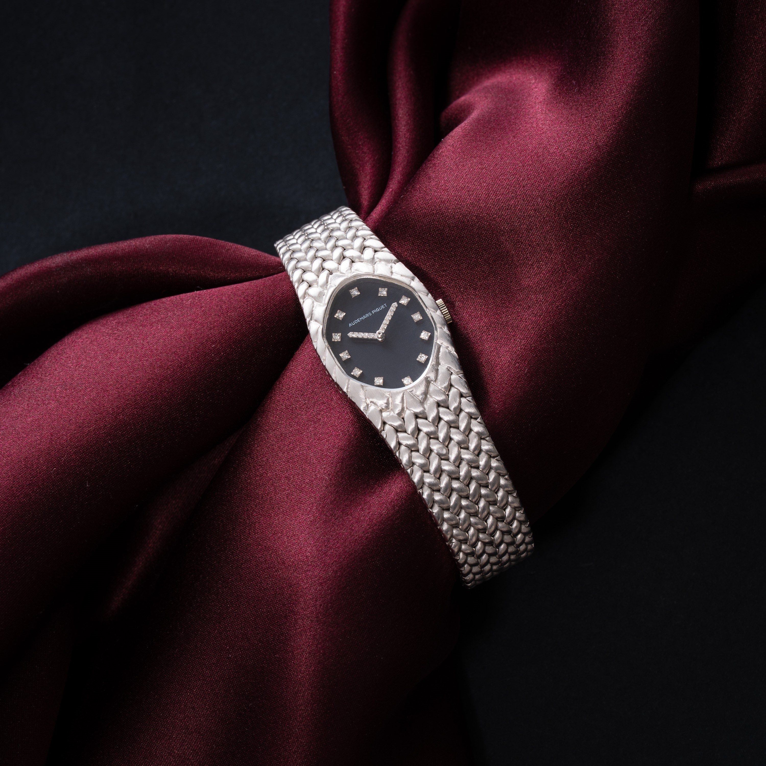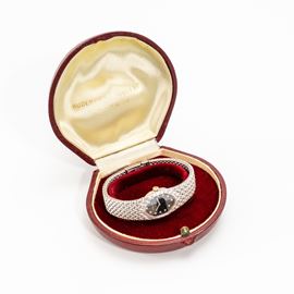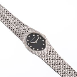 Note: Orologio solo tempo a carica manuale in oro bianco 18 kt con bracciale integrato Gilbert Gaschen in oro bianco 18 kt. Quadrante nero, indici e sfere diamante taglio brillante. Fondello a pressione in oro bianco 18 kt. Vetro minerale piatto
