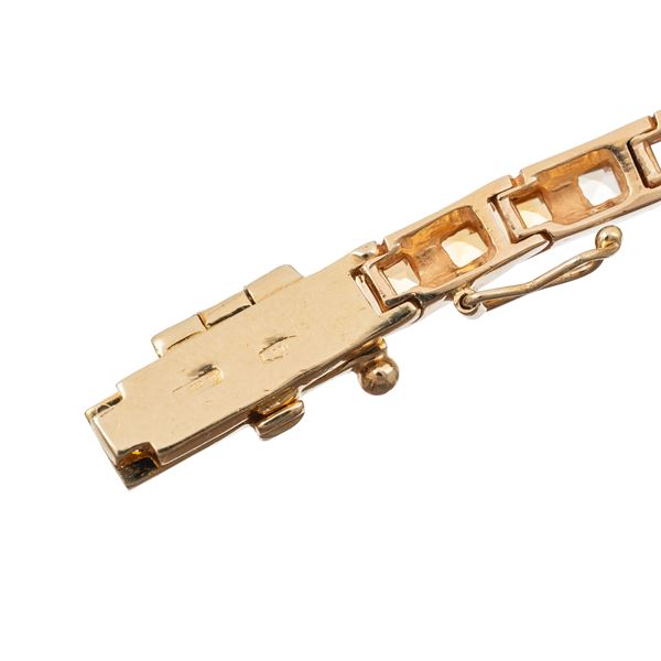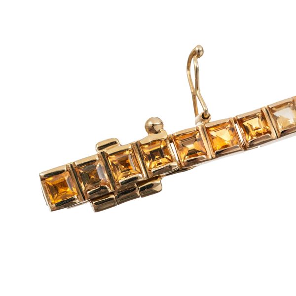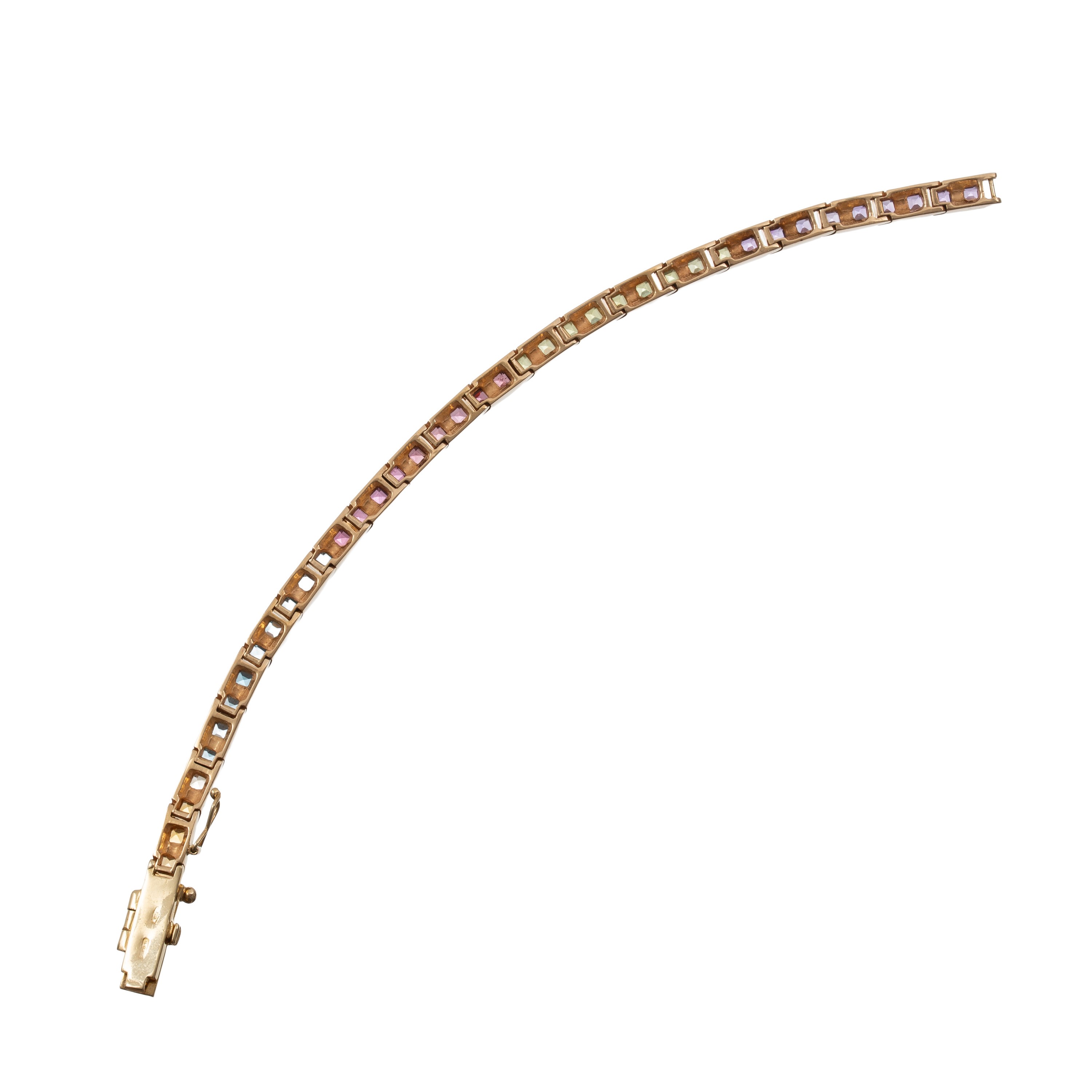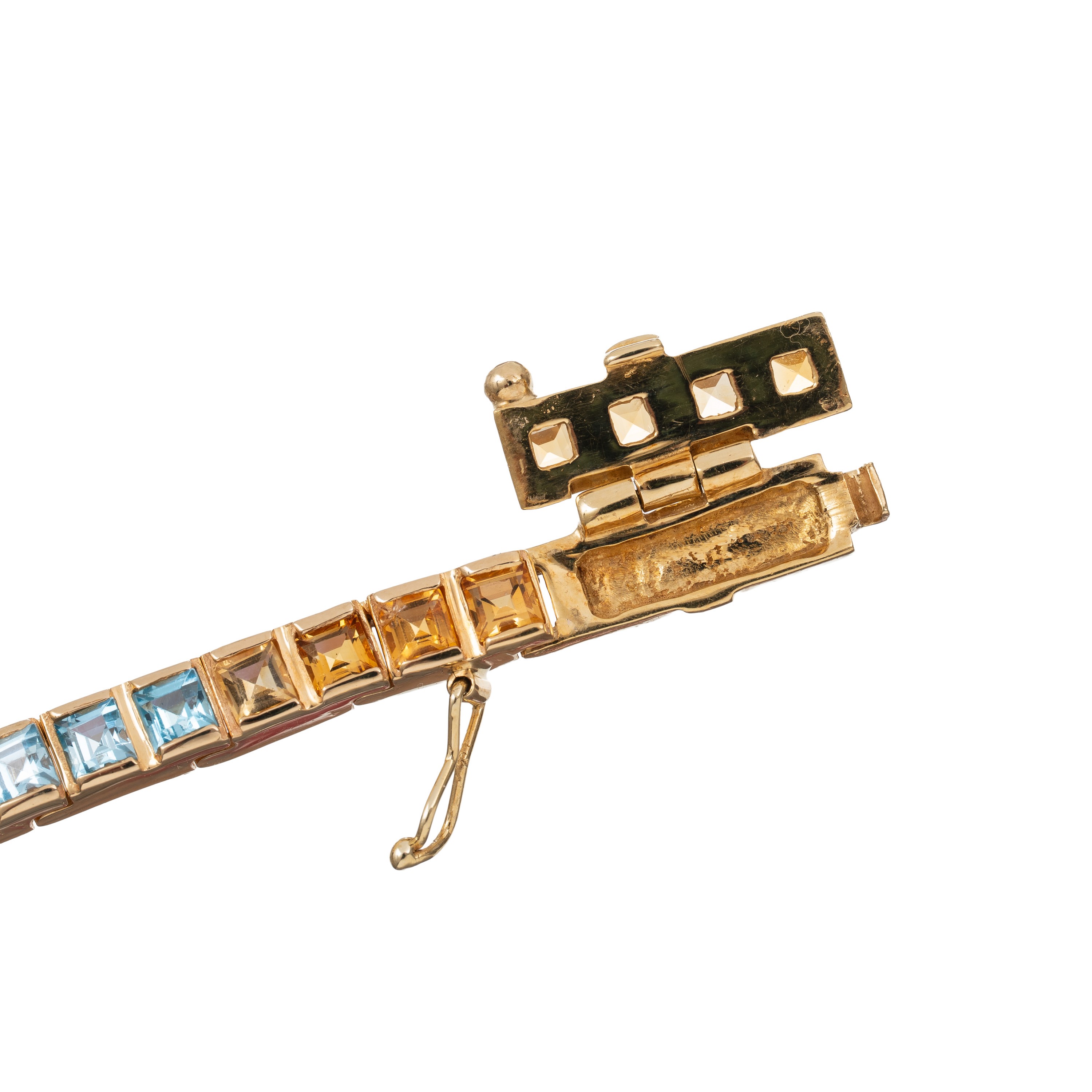 Bracciale in oro giallo 18 kt, con pietre quali ametista, peridoto granato, topazio azzurro e quarzo citrino, taglio carré, misura 3,50 mm, lunghezza 18 cm, peso 25,40 gr