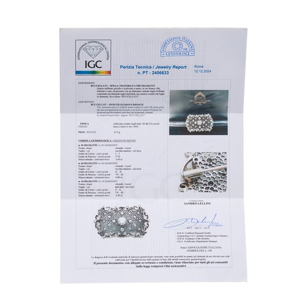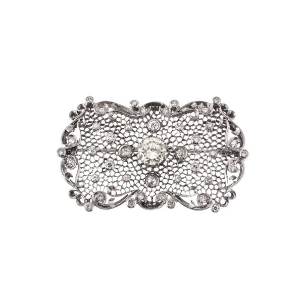 Spilla in oro bianco 18 kt con diamante centrale taglio old mine di 1.60ct, colore I-J, purezza VVS; 4 diamanti di 0.80ct taglio old mine, colore G-H, purezza VS-SI; 34 diamanti taglio huit-huit per2.20ct, colore F-G, purezza VS-SI. Peso: 21.90gr. Dimensione: 33x53 mm . Scatola, certificato.