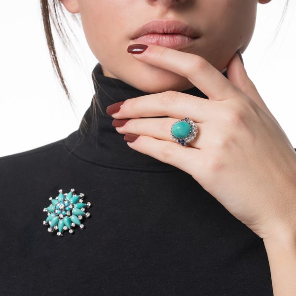 Spilla con diciotto turchesi, peso stimato 13 ct, colore strong greenish blue e light blue, taglio goccia e rotonda, cabochon. Trentuno diamanti di cui pietra centrale di 0,20 ct e pietre contorno di 1,85 ct totali, colore G-H, forma rotonda, taglio brillante, purezza VVS-VS, dimensioni 38,50 X 38,50 mm, peso totale 15,79 gr