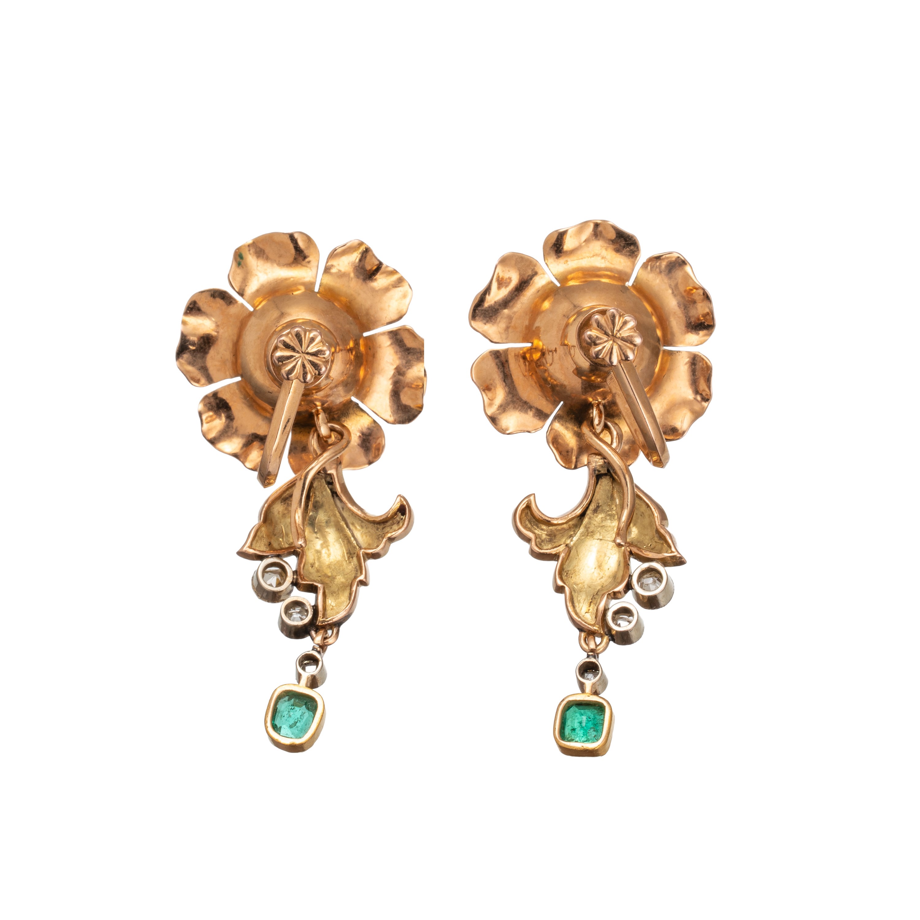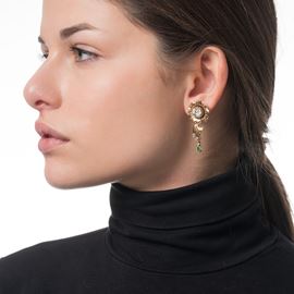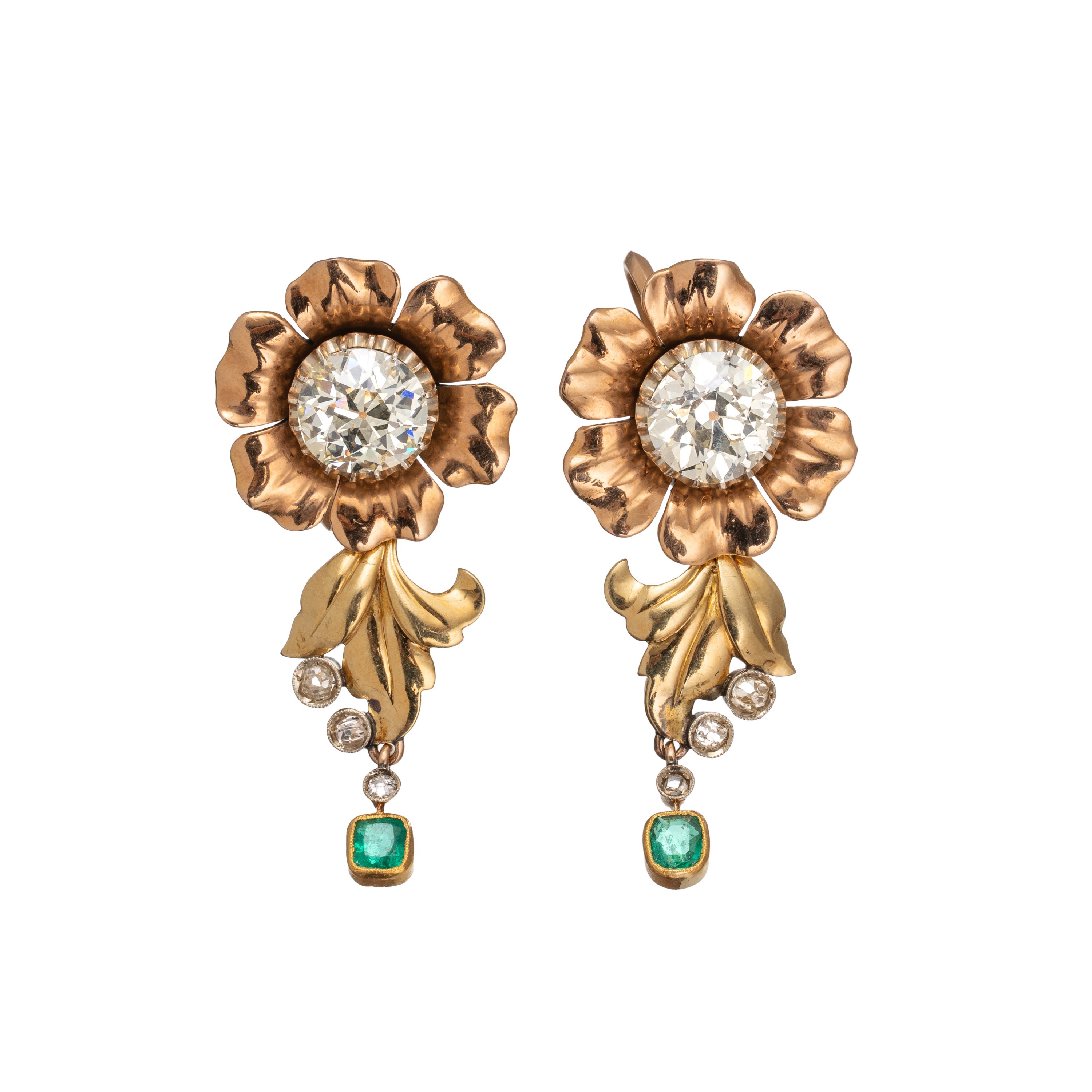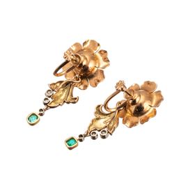 Orecchini oro giallo e bianco 18 kt, due diamanti principali di stimati ct. 2,00 ciascuno, colore stimato Q-R, taglio Vecchia Europa, purezza SI con ciondolo staccabile con piccole rosette di diamante e smeraldo, misure 18 X 40 mm, peso 13,50 gr