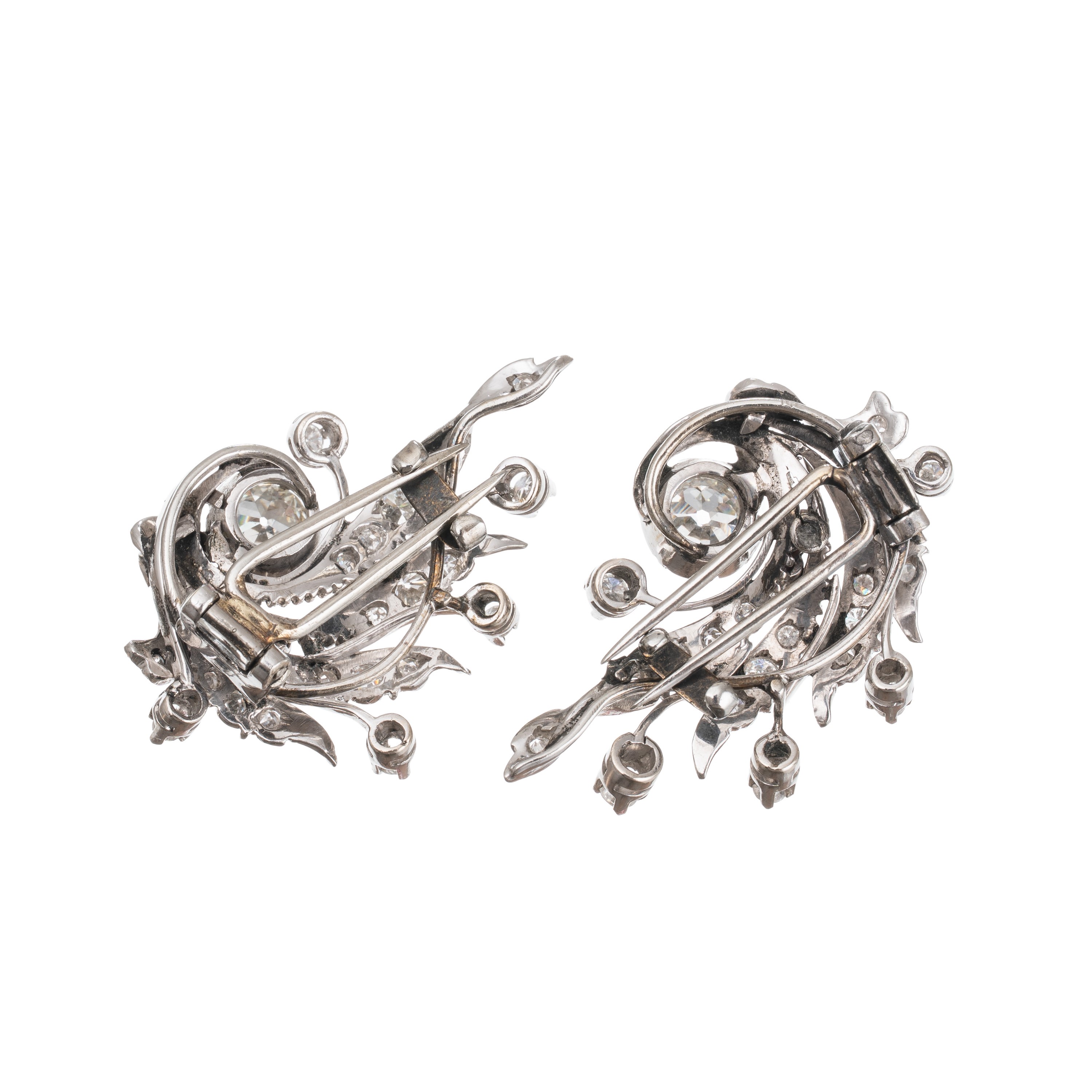 Orecchini in platino con due pietre centrali di 1,25 ct totali, colore I e J, forma rotonda, taglio brillante vecchia Europa, purezza VS1 e SI1 contornati da quarantasei diamanti di 1 ct totale, incolori, taglio huit huit e taglio brillante, peso 17,54 gr