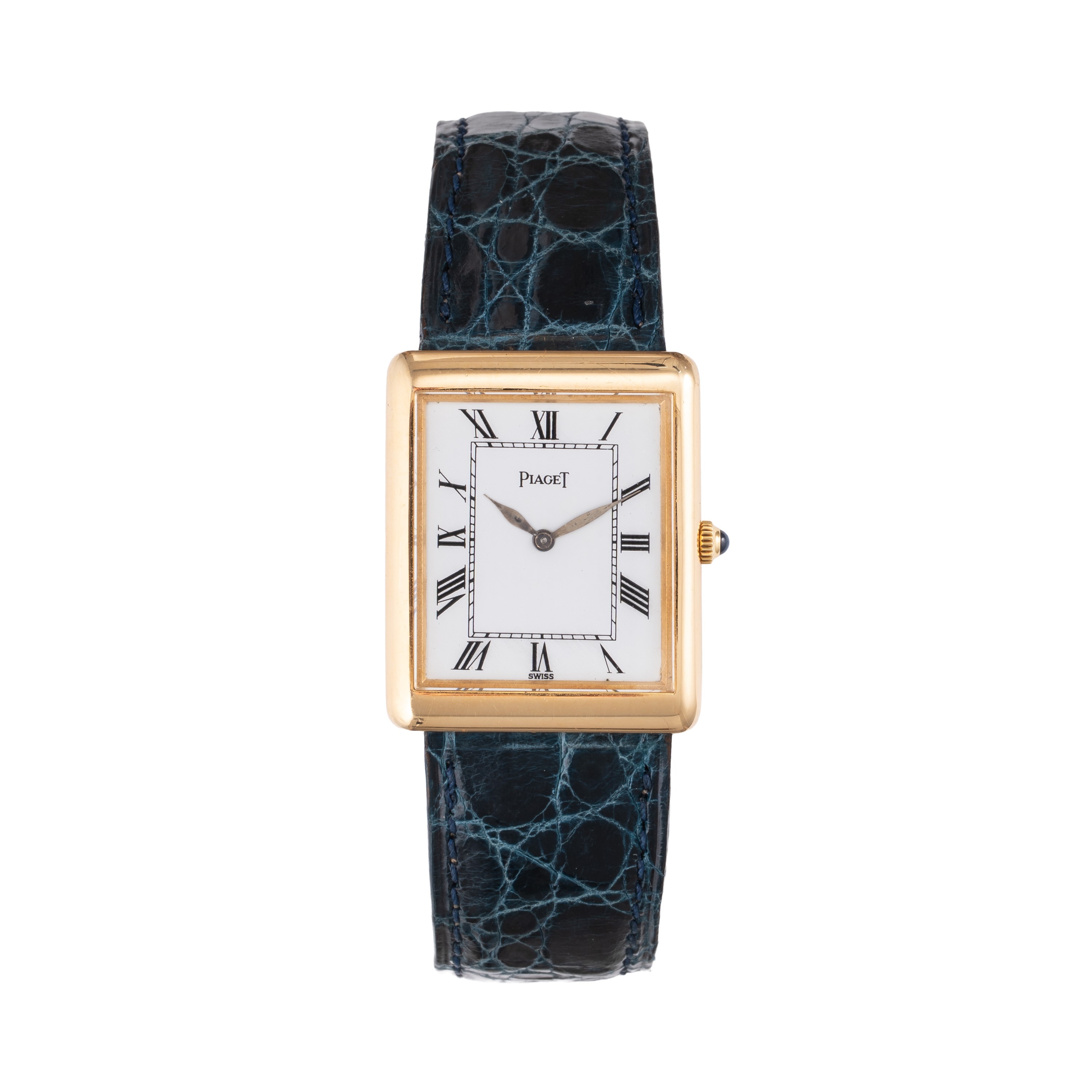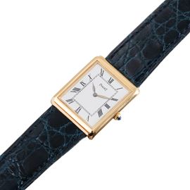 Note: Orologio solo tempo a carica manuale in oro giallo 18kt. Quadrante bianco, indiri romani neri, sfere a foglia, corona con cabochon. Cinturino in pelle, fibbia in oro giallo 18kt Piaget. Vetro minerale piatto.