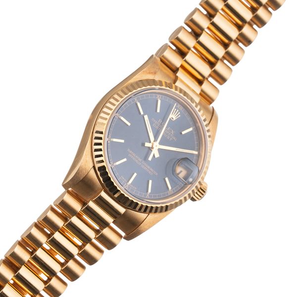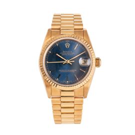 Note: Orologio solo tempo a carica automatica in oro giallo 18 kt con bracciale ‘President’ in oro giallo 18 kt. Quadrante blu, indici e sfere a bastone dorati. Datario ad ore tre. Vetro zaffiro piatto. Fondello a vite in oro giallo 18 kt.