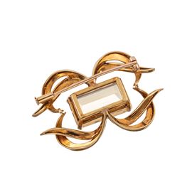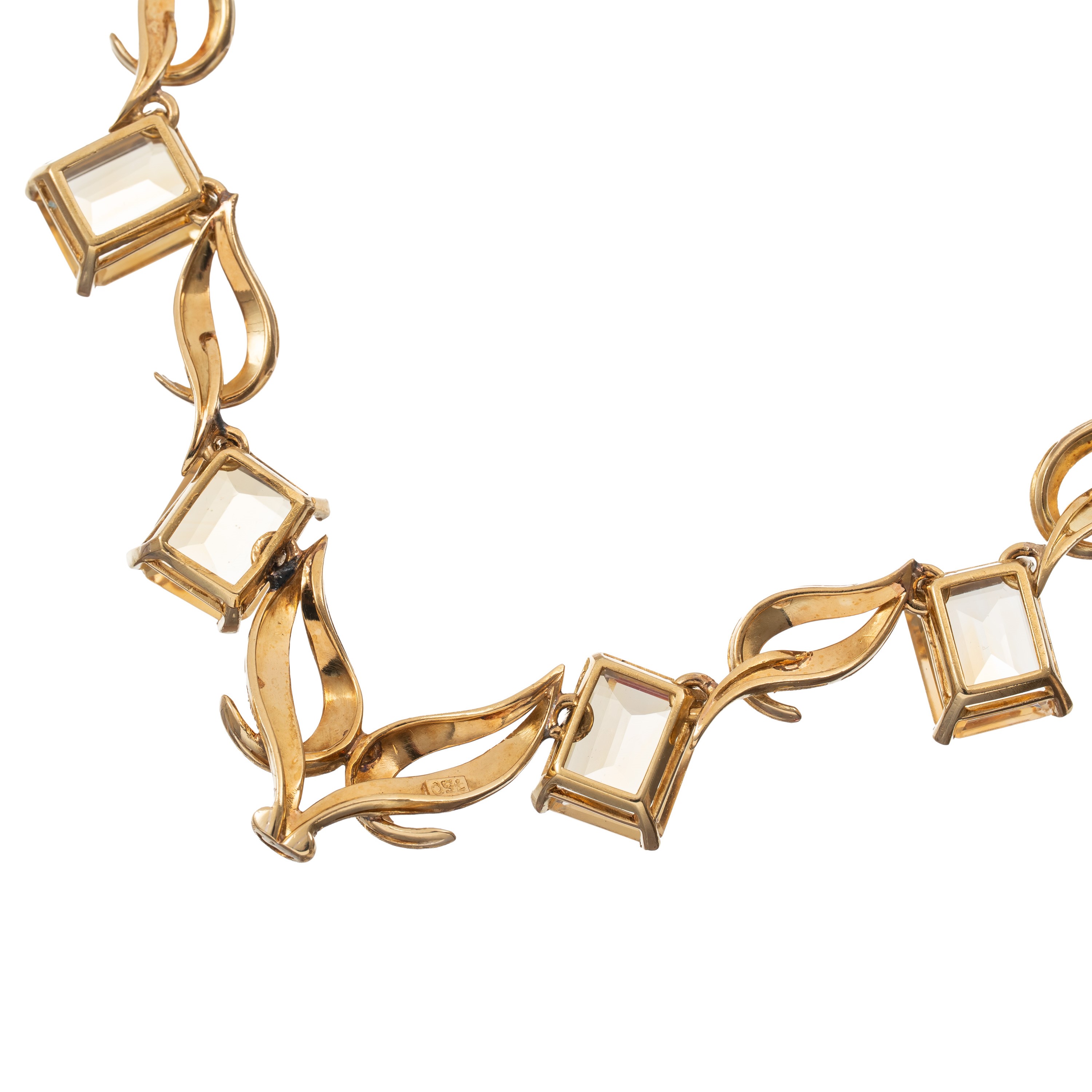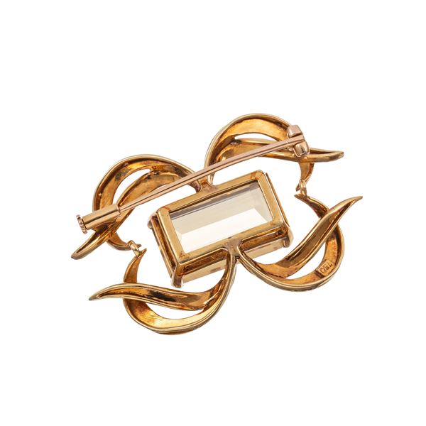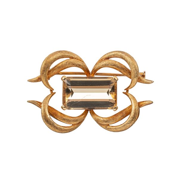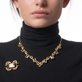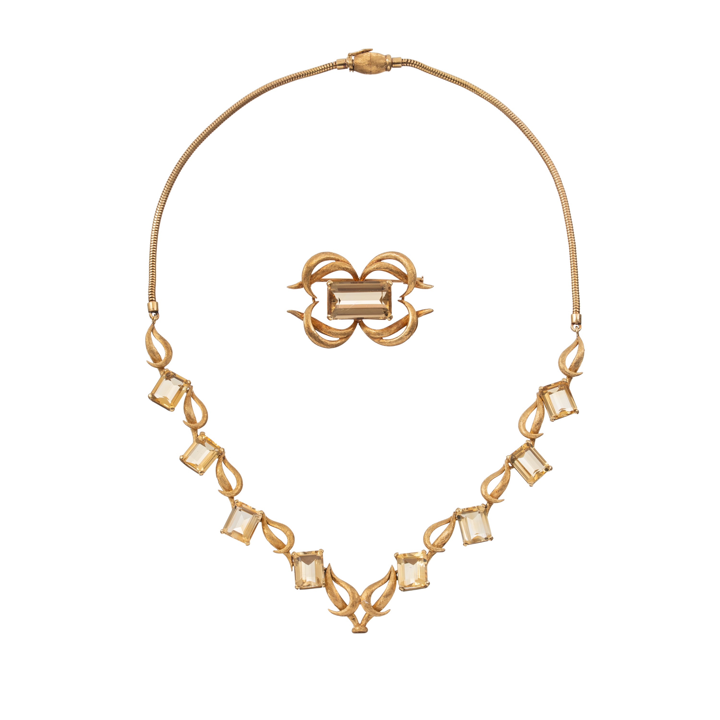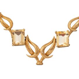 Spilla e girocollo in oro giallo 18 kt, quarzi citrini, lunghezza girocollo 45 cm, dimensioni spilla 4,5 X 3 cm, peso 62,50 gr