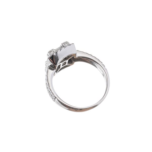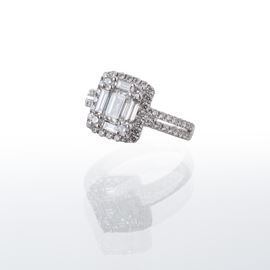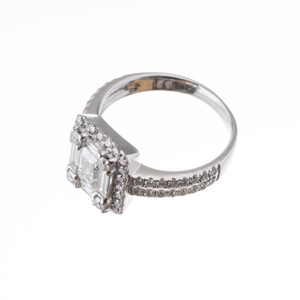 Anello in oro bianco 18 kt con diamante centrale, taglio smeraldo, di 0,51 ct, e contorno di diamanti, taglio brillante, per 0,45 ct.