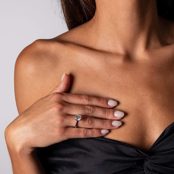 Anello in oro bianco 18 kt con diamante di 4,04 ct, colore J, taglio brillante, purezza VS1, dimensioni 9,93-10,17X6,17 mm. Misura: 54/14, peso: g 6.