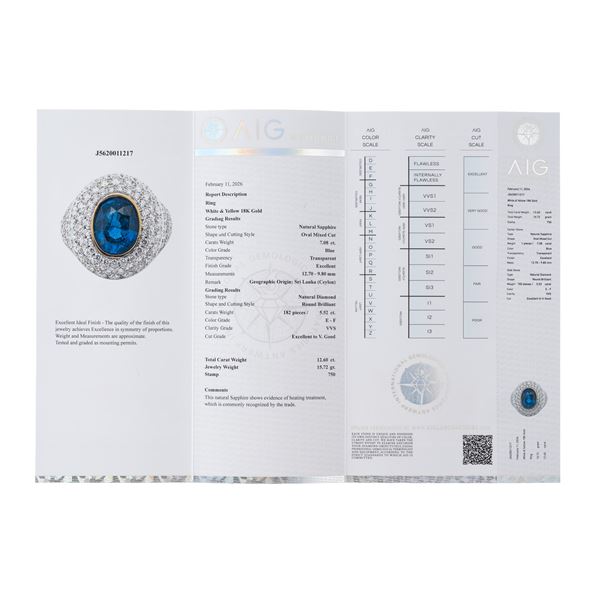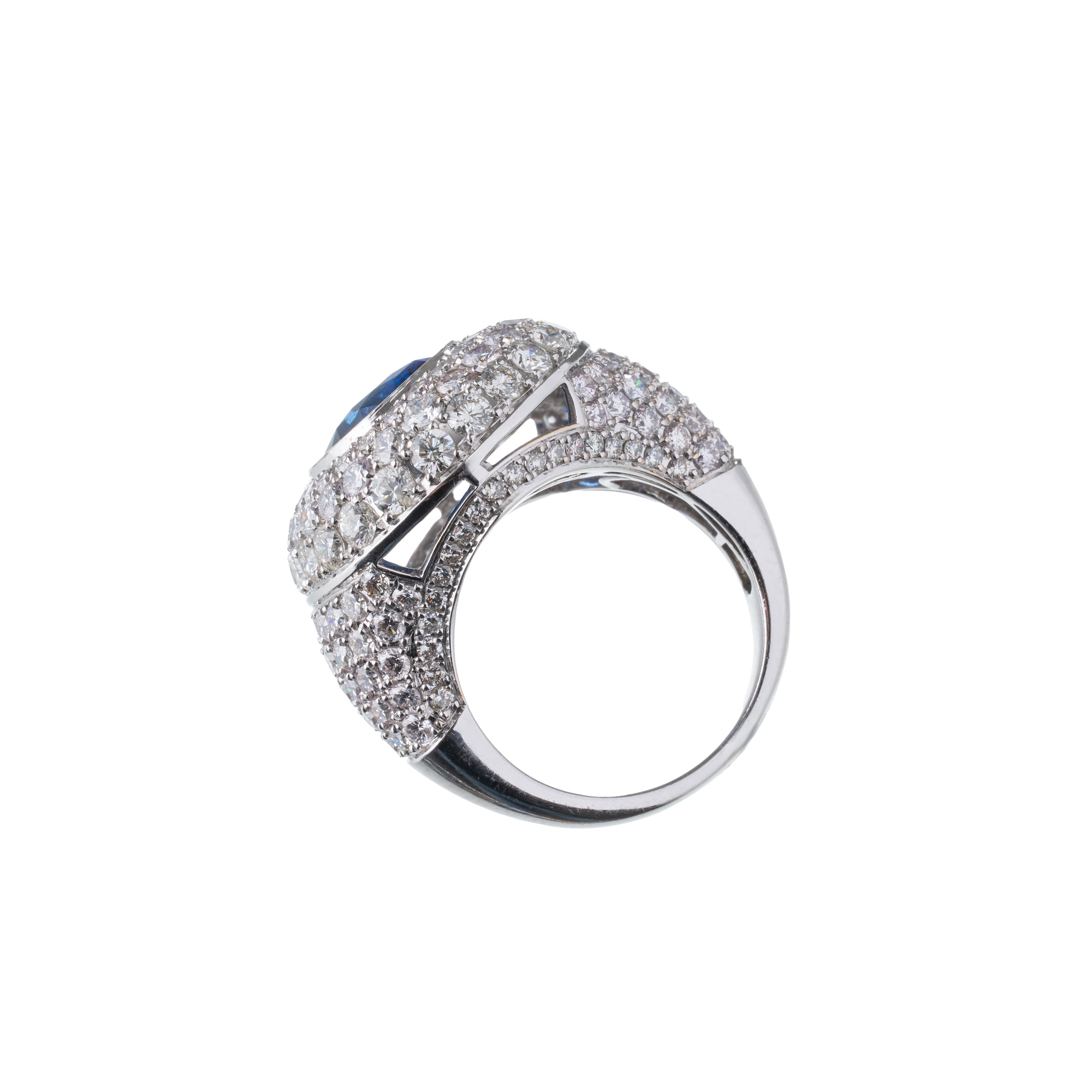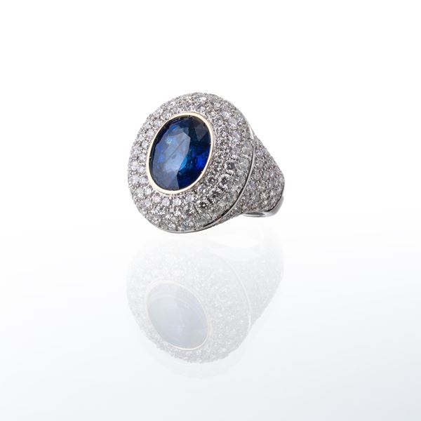 Anello in oro bianco 18 kt, con pavé di diamanti, ct 5,52, e con zaffiro centrale, forma ovale, ct 7,08. Misura: 15/55, peso: g 15,72.