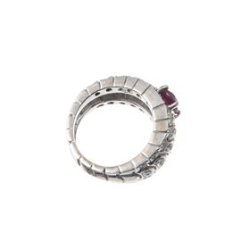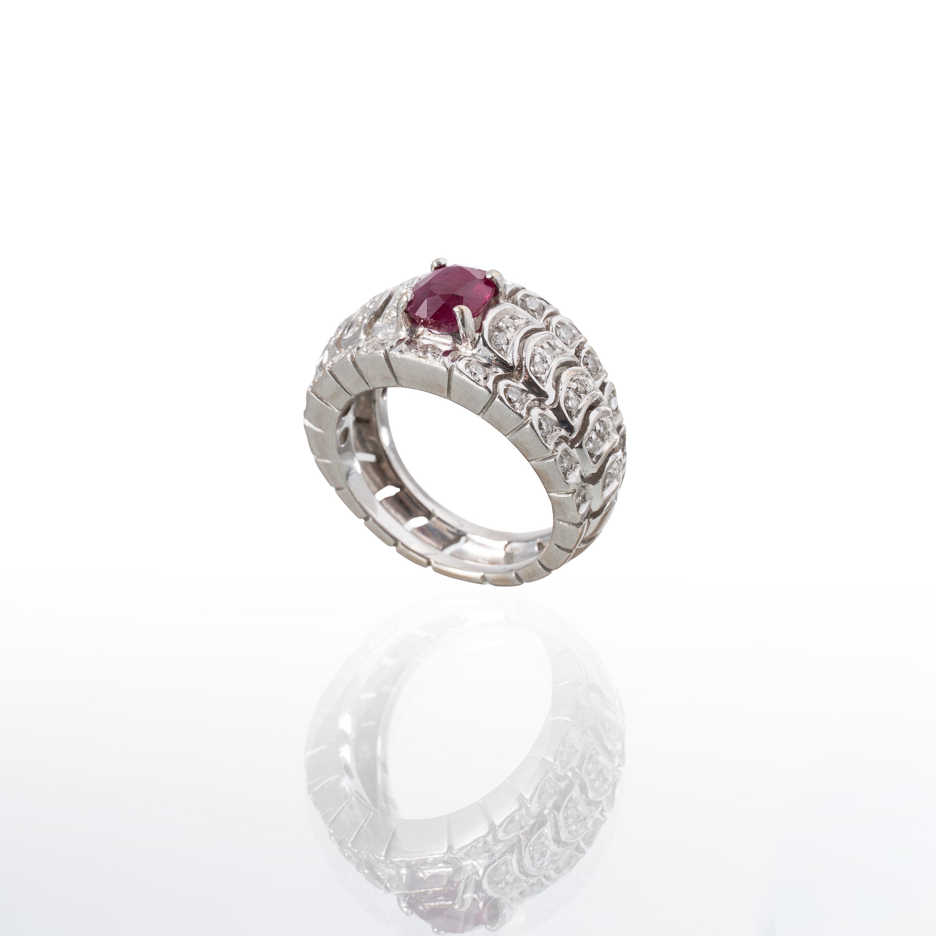 Anello in oro bianco 18 kt con rubino, di ct 1,00 ca, e diamanti, taglio brillante, per ct 0,60 ca.