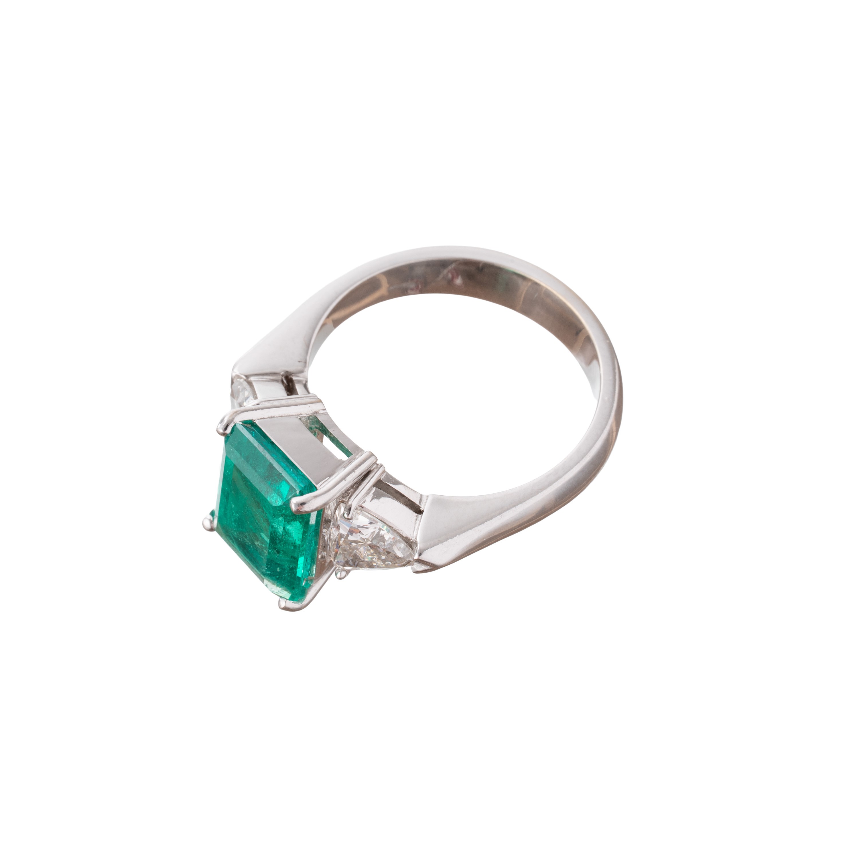 Anello in oro bianco 18 kt, con smeraldo di stimati 3,00 ct, diamanti taglio triangolare laterali di 1,50 ct totali. Misura: 55/15, peso: g 7,70.