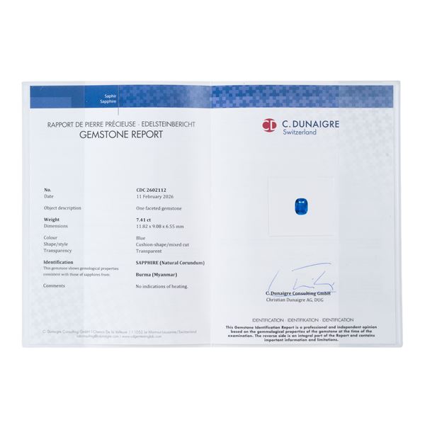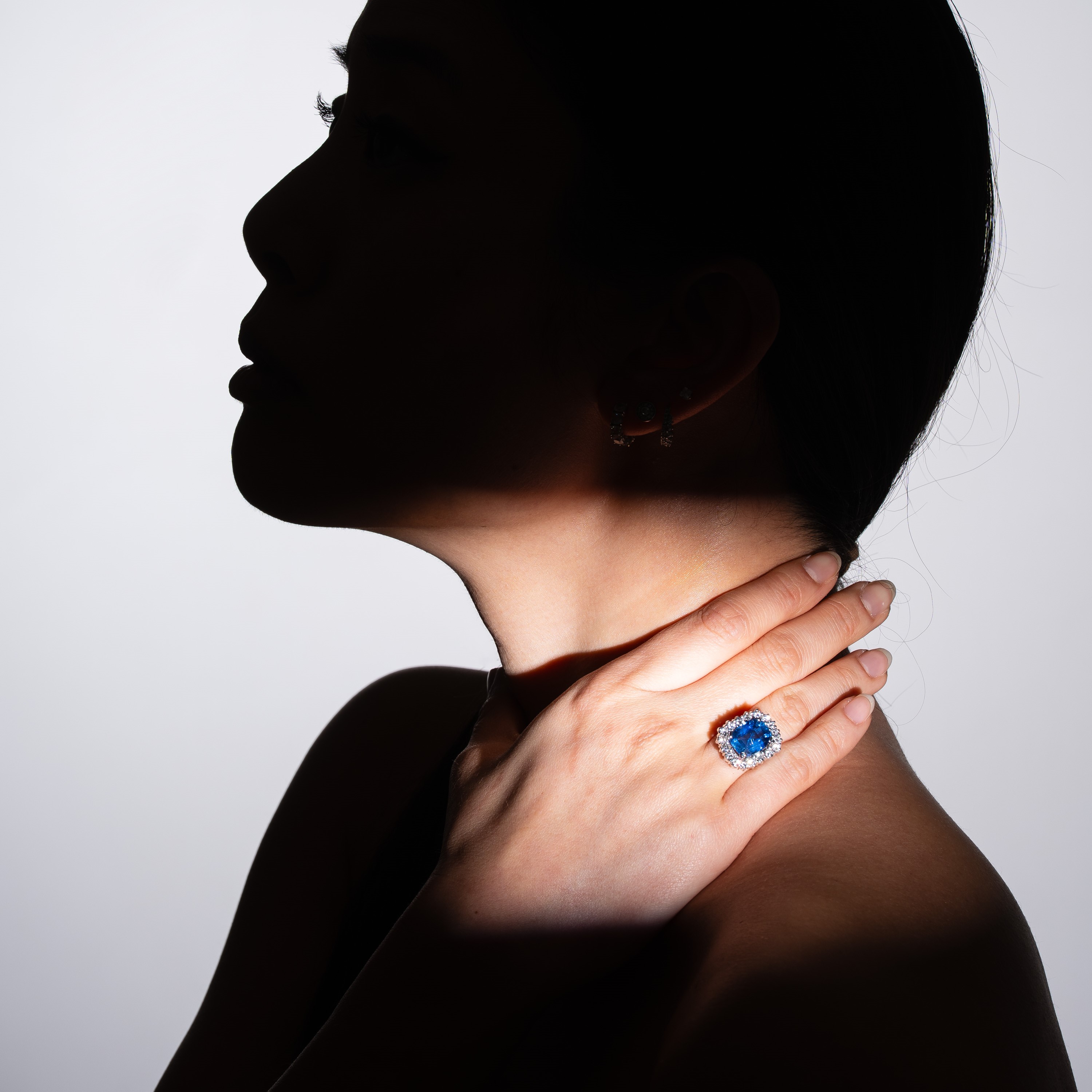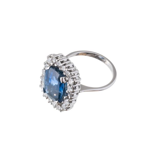 Anello in oro bianco 18 kt, con diamanti e zaffiro Burma No Heat, di 7,41 ct, dimensioni 16x19 mm. Misura: 49/9, peso: g 8,3.