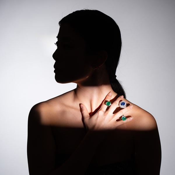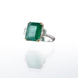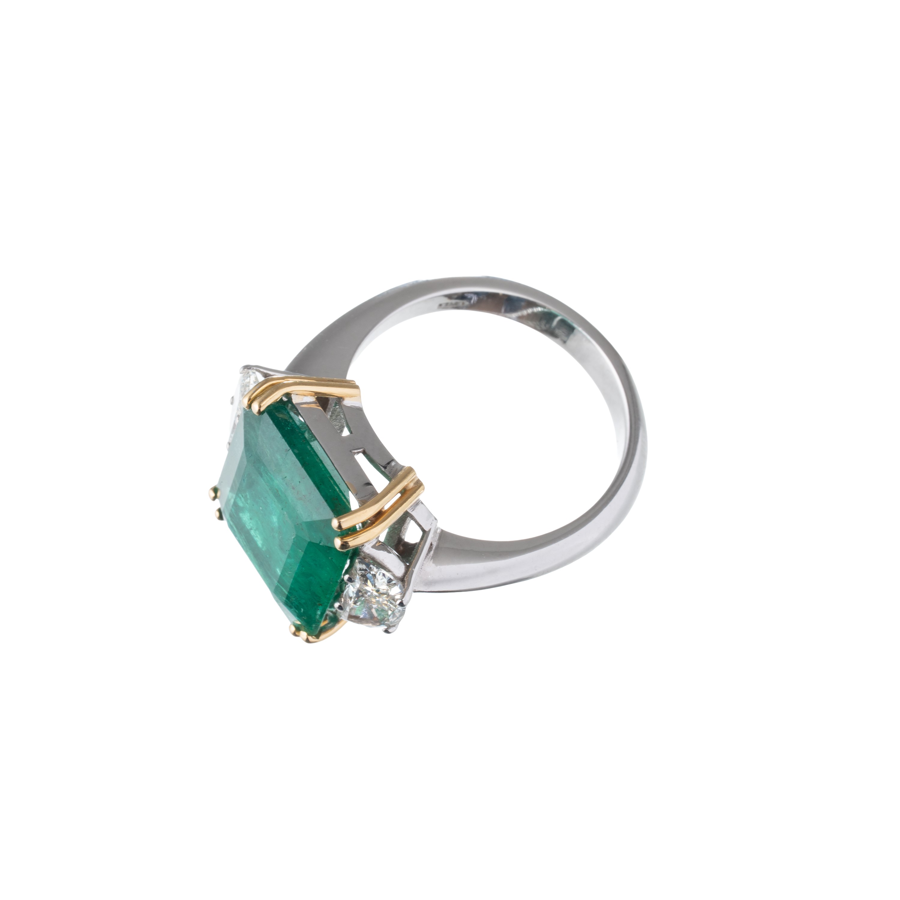 Anello in oro bianco e giallo con diamanti ct 1,06 e smeraldo taglio smeraldo di ct. 7,15. Misura: 15/55, peso: g 7,78.