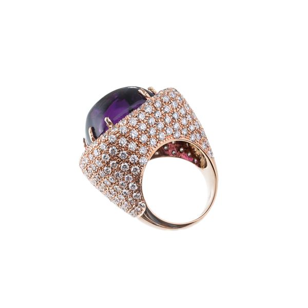 Anello in oro giallo 18 kt, con ametista cabochone di circa 15 ct, con contorno di diamanti taglio brillante per stimati 5 ct. Dimensioni: 26x28 mm, misura: 53/13. Peso: 34,80 g.