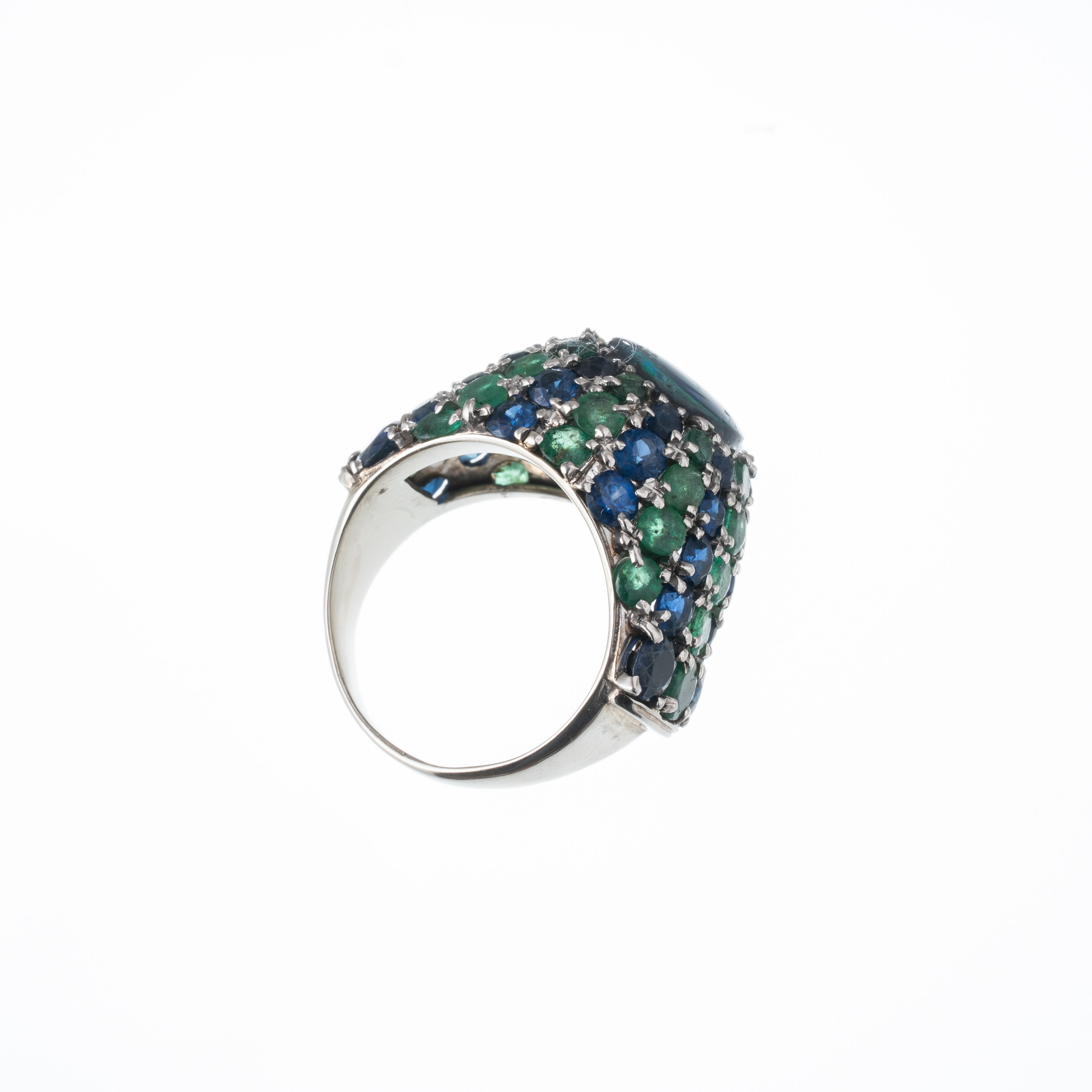 Anello in oro giallo 18 kt, con contorno di zaffiri e opale nero australiano centrale, di ct 2,59. Misura: 53/13, peso: g 11,3.