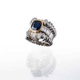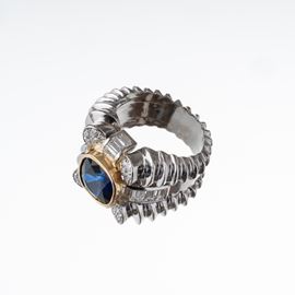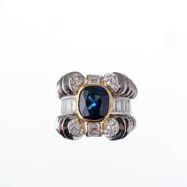 ANELLO IN PLATINO CON ZAFFIRO CENTRALE E DIAMANTI TAGLIO BRILLANTE E BAGUETTE