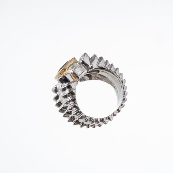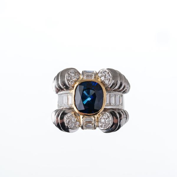 Anello in platino con zaffiro centrale, stimati 3 ct, taglio cushion misto e contorno di diamanti taglio brillante per stimati 0,20 ct, F-H VS-SI, taglio baguette a gradini, per 1,40 ct, F-H VS-SI. Dimensioni: 18,6X23 mm, misura: 50/10. Peso: g 23,48.