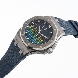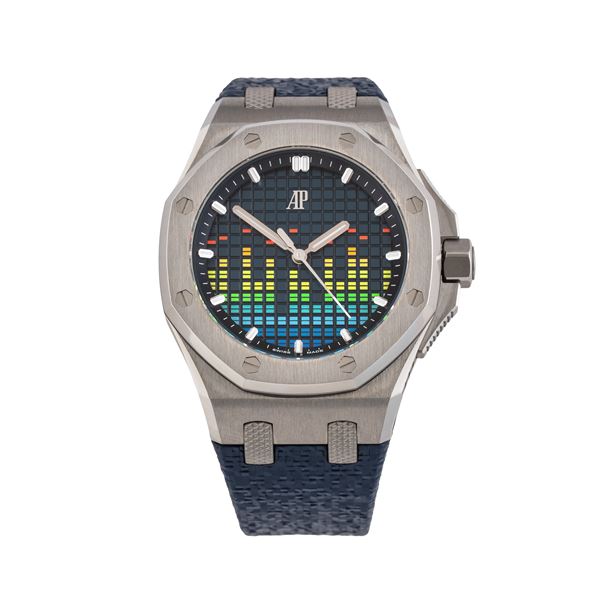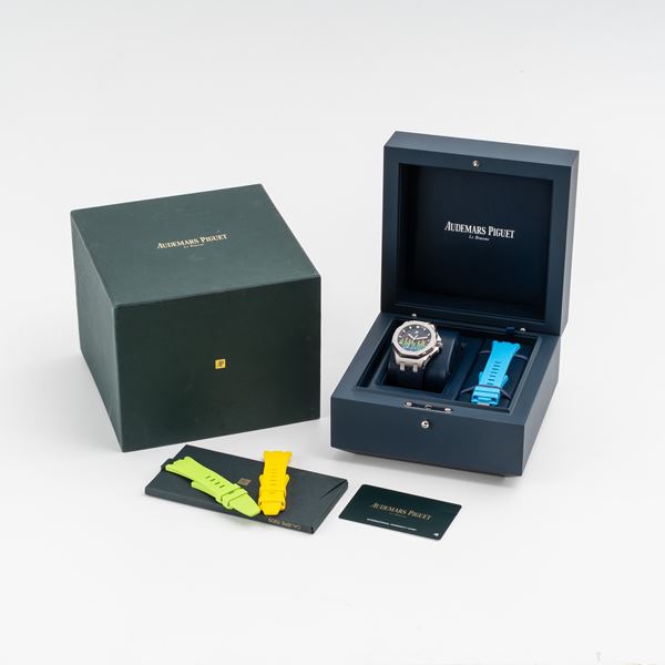 Note: Orologio solo tempo a carica automatica in acciaio. Quadrante colorato. Indici e sfere a bastone con materiale luminescente. Cinturino in gomma e fibbia in acciaio Audemars Piguet. Vetro minerale piatto. Fondello a vista. Edizione limitata di 500 pezzi.