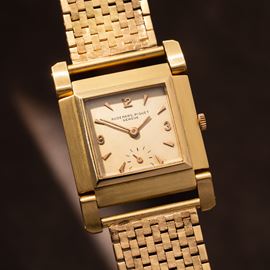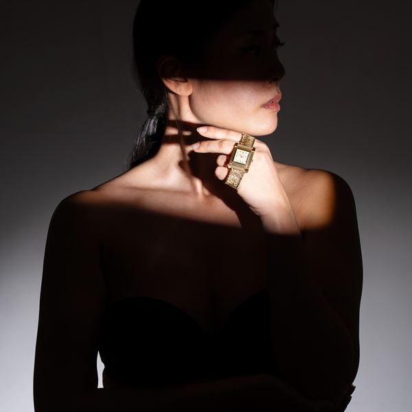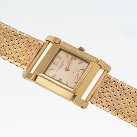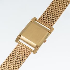 Note: Orologio solo tempo a carica manuale in oro giallo 18 kt e bracciale in oro giallo 18 kt. Cassa con anse snodabili prodotta da Markowski. Quadrante color crema, indici arabi dorati ad ore tre, nove e dodici. Piccoli secondi ad ore sei. Sfere a bastone dorate. Bracciale in oro giallo 18 kt. Vetro minerale bombato. Fondello a pressione in oro giallo 18 kt. Peso totale: 57,4 g.