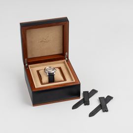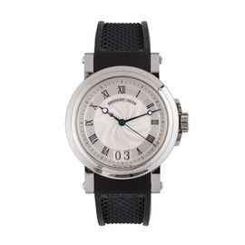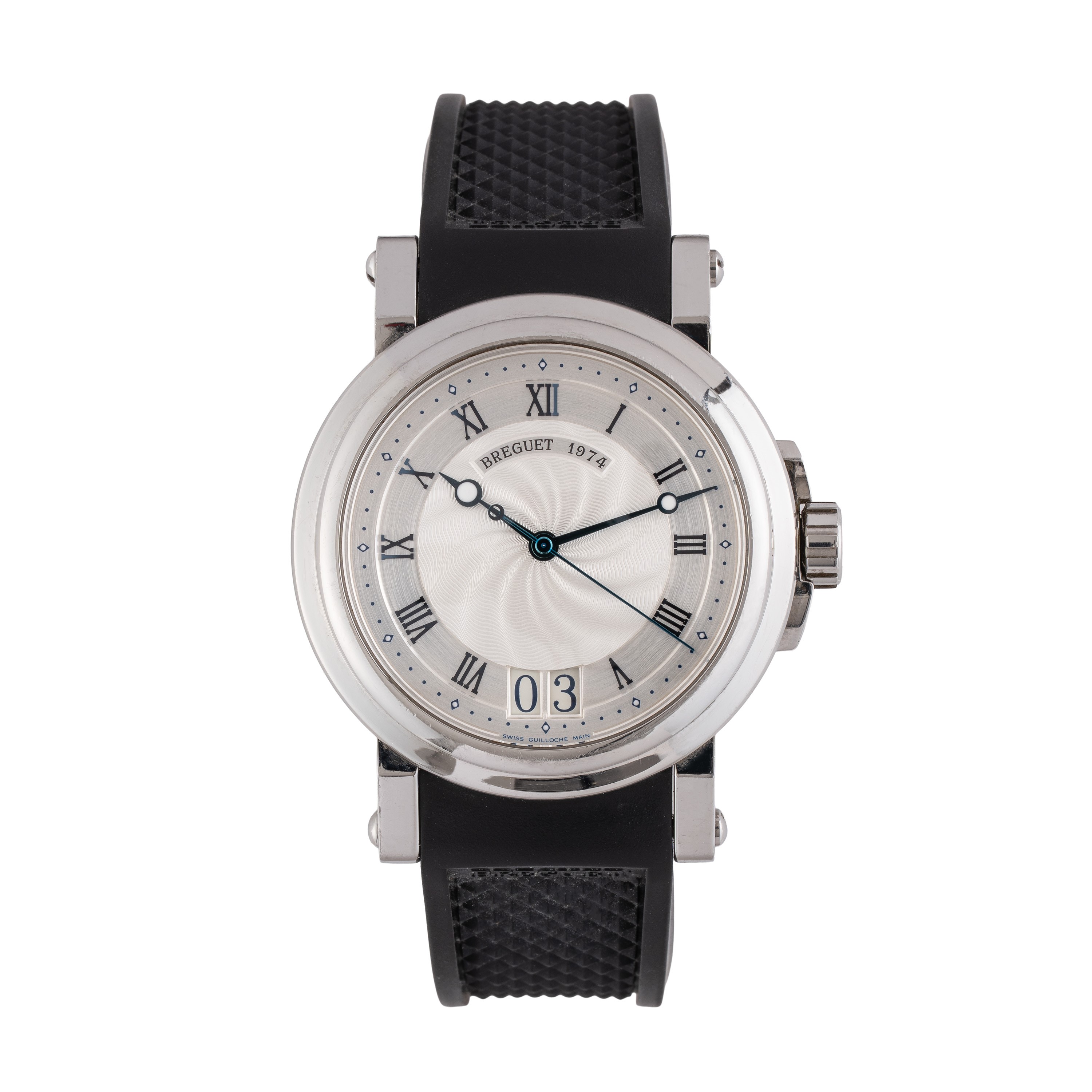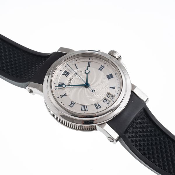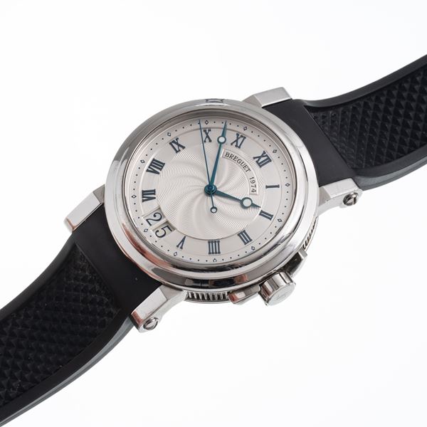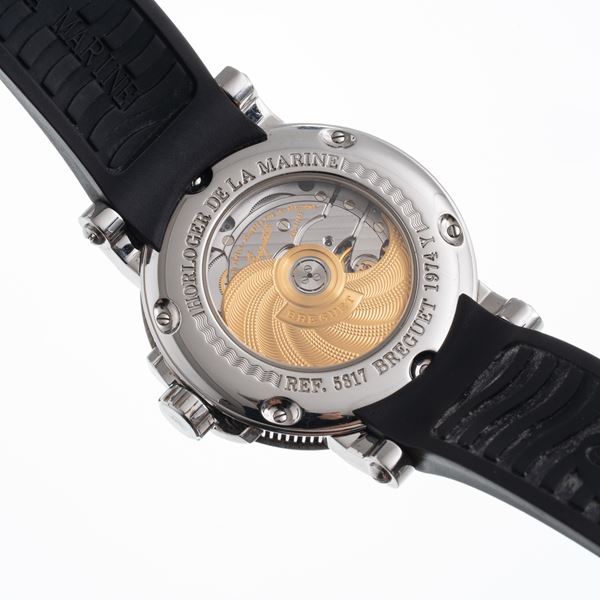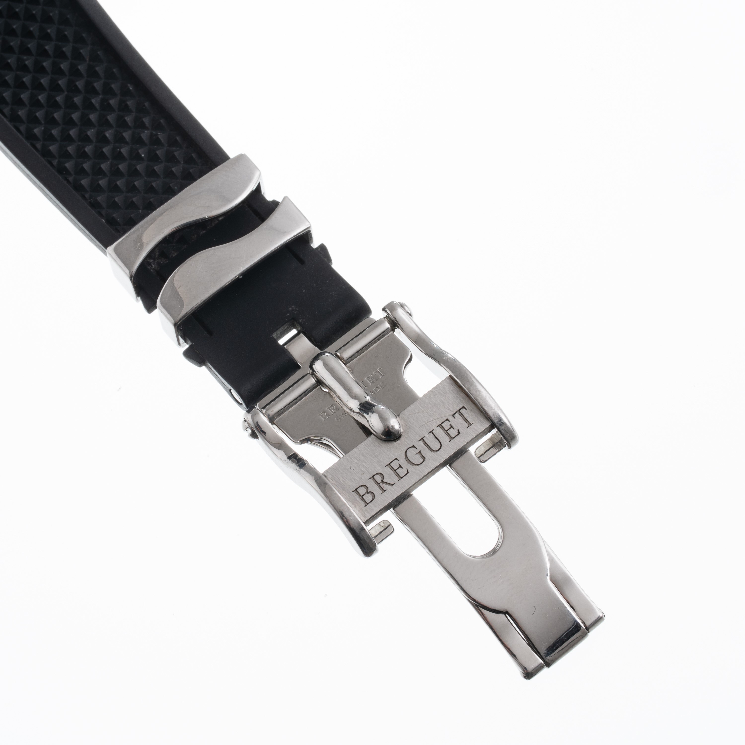 Note: Orologio solo tempo a carica manuale in acciaio. Quadrante bitonale con parte centrale guilloché, indici romani bruniti blu, sfere breguet con materiale luminescente bruniti blu. Datario ad ore sei. Cinturino in gomma e deployante in acciaio Breguet. Vetro minerale piatto. Fondello a vista in acciaio.