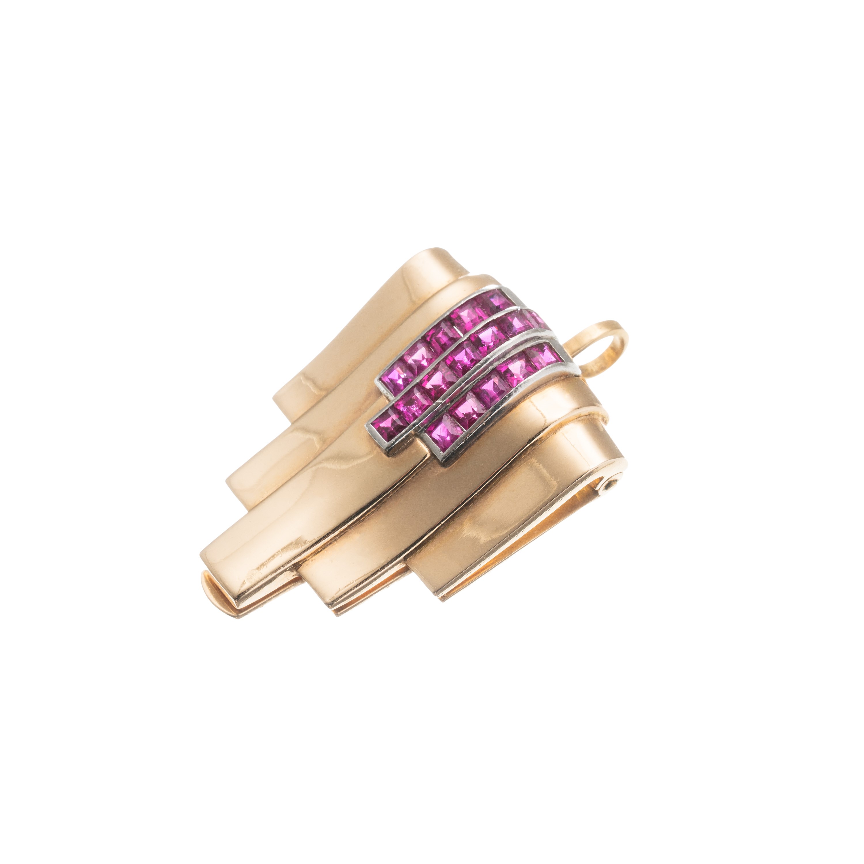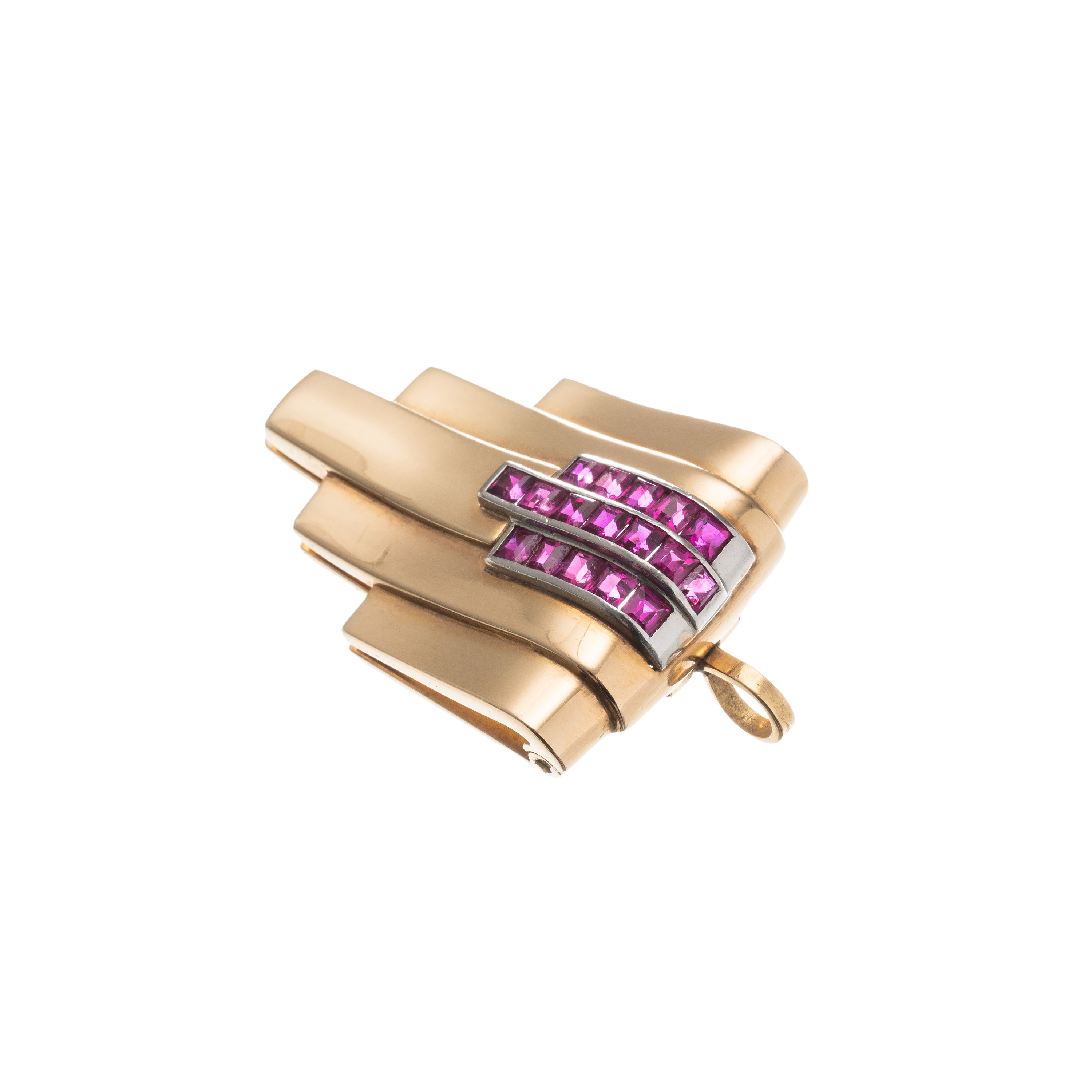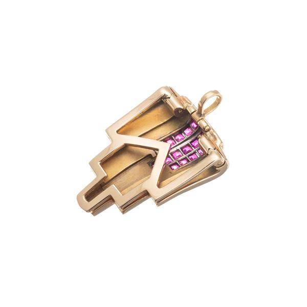 Ciondolo clip in oro giallo 18 kt con diciasette rubini, taglio carrè, per stimati ct 0,85.