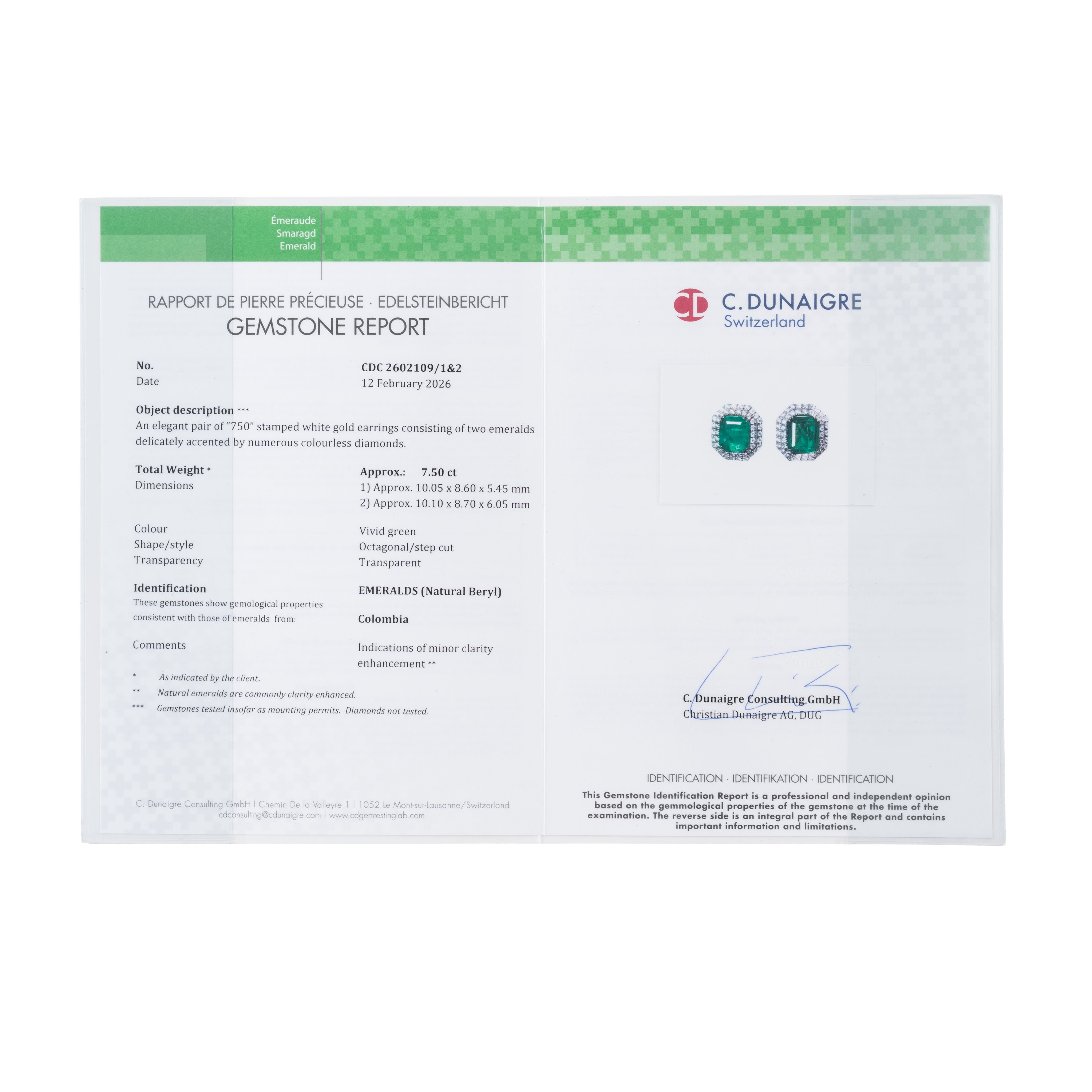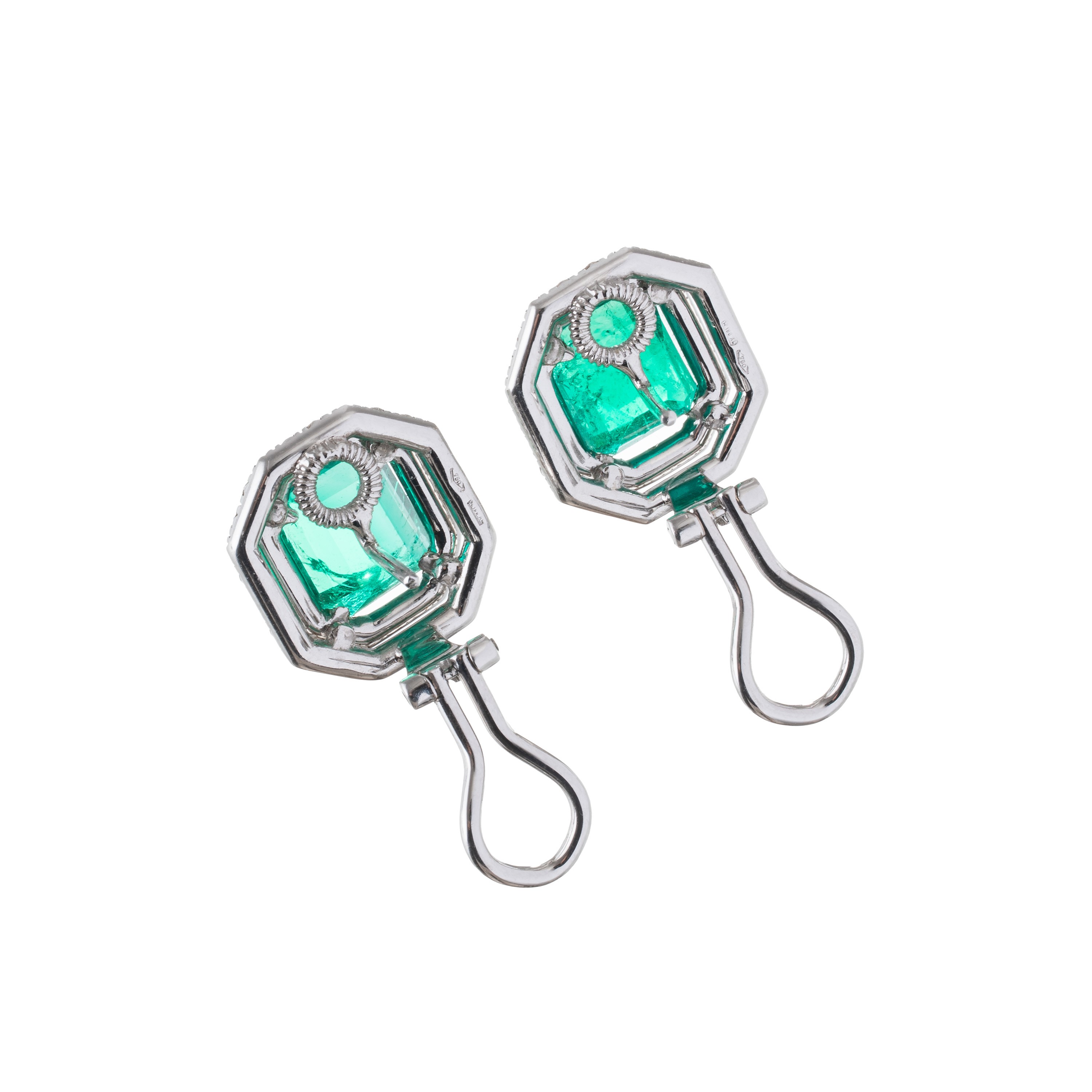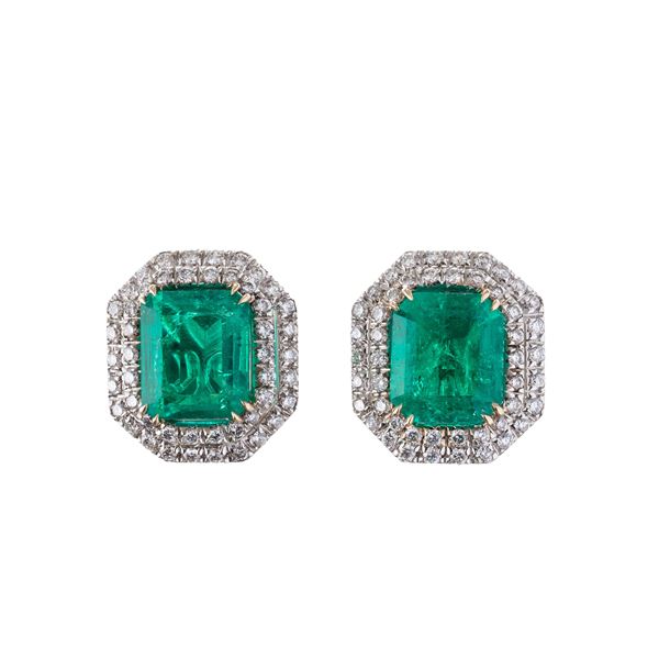 Orecchini in oro bianco 18 kt, con due smeraldi per stimati 7,50 ct, vivid green transparent colombia. Dimensioni: 15,3X17 mm, peso: g 11,5.