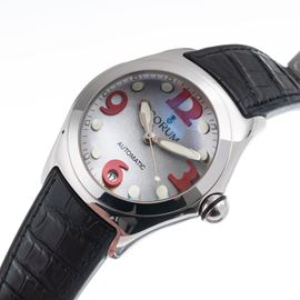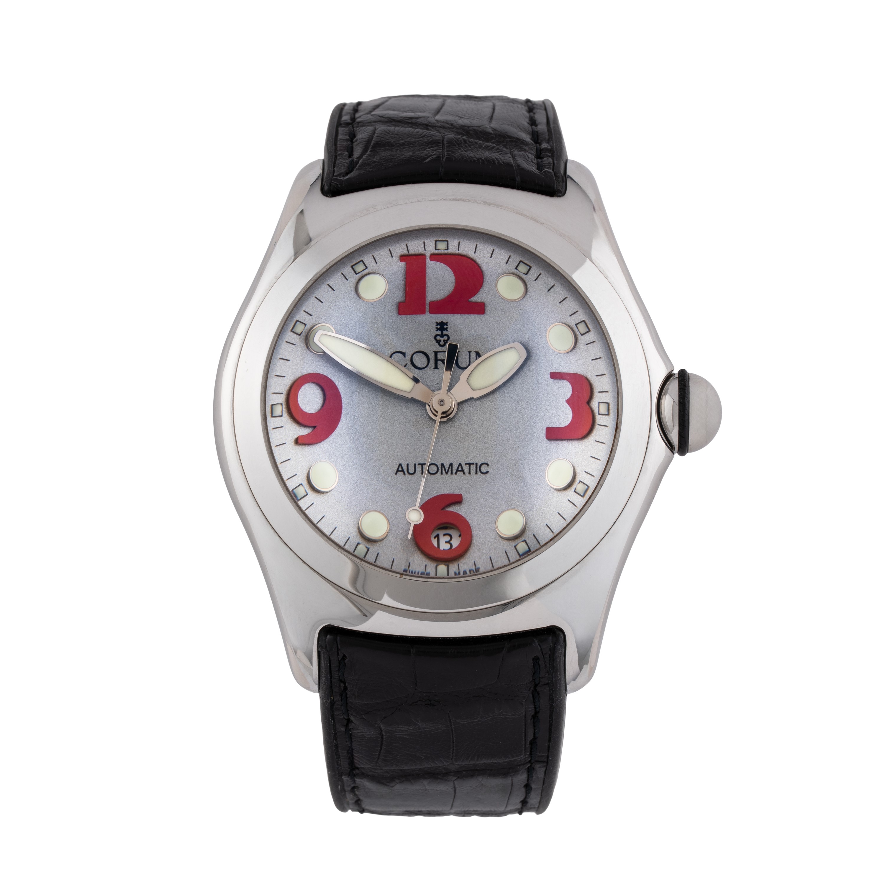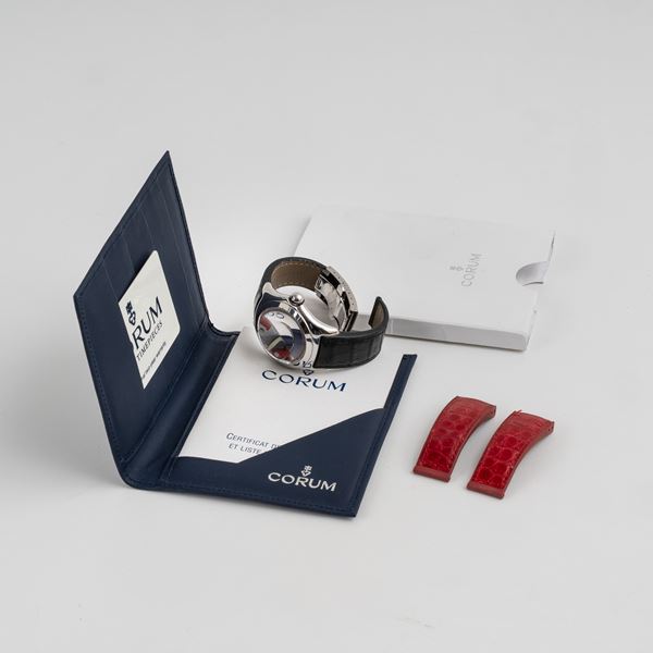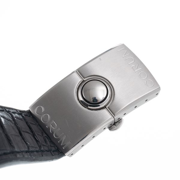 Note: Orologio solo tempo a carica automatica in acciaio. Quadrante argenté, datario ad ore sei, indici arabi rossi ad ore tre, sei,nove e dodici. Sfere con materiale luminescente. Cinturino in pelle Corum e clasp in acciaio Corum.Vetro minerale 'a bolla'. Fondello in acciaio a vista.