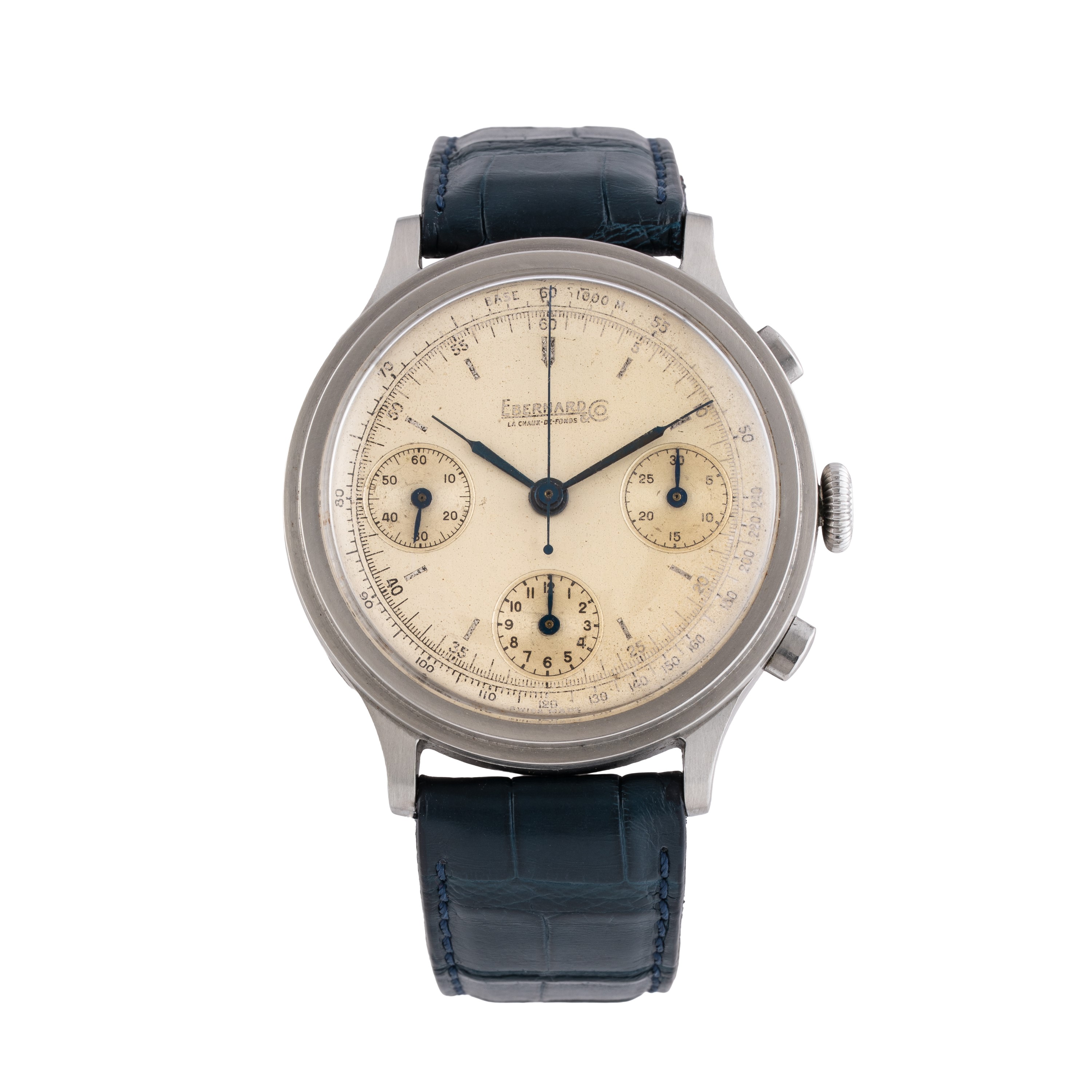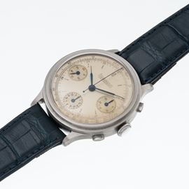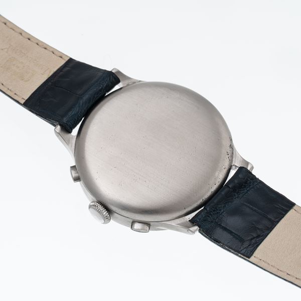Note: Cronografo a carica manuale in acciaio con cassa a scalino. Quadrante argenté, tre contatori, sfere brunite blu. Scala tachimetrica a base mille. Corona a cipolla. Pulsante di stop cronografico a slitta. Vetro plexiglass bombato. Fondello in acciaio a pressione.
