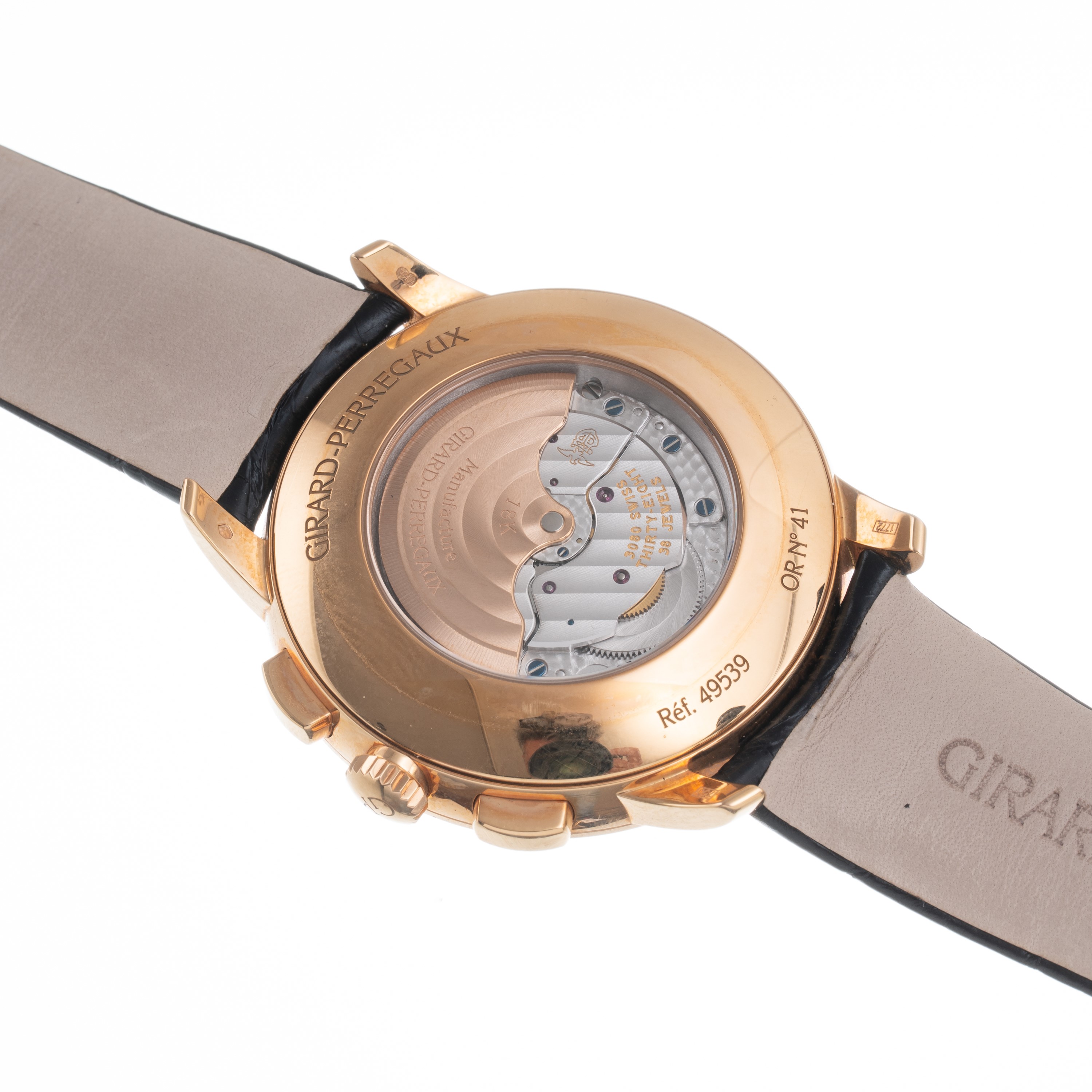 Quadrante argenté, indici a bastone e arabi ad ore sei e dodici dorati. Scala tachimetrica nera. Sfere a foglia dorate. Cinturino in pelle e fibbia in oro rosa 18 kt Girard Perregaux. Vetro minerale bombato. Fondello a vista in oro rosa 18 kt. Peso testa orologio: 73,6 g. Peso totale: 81,8 g.