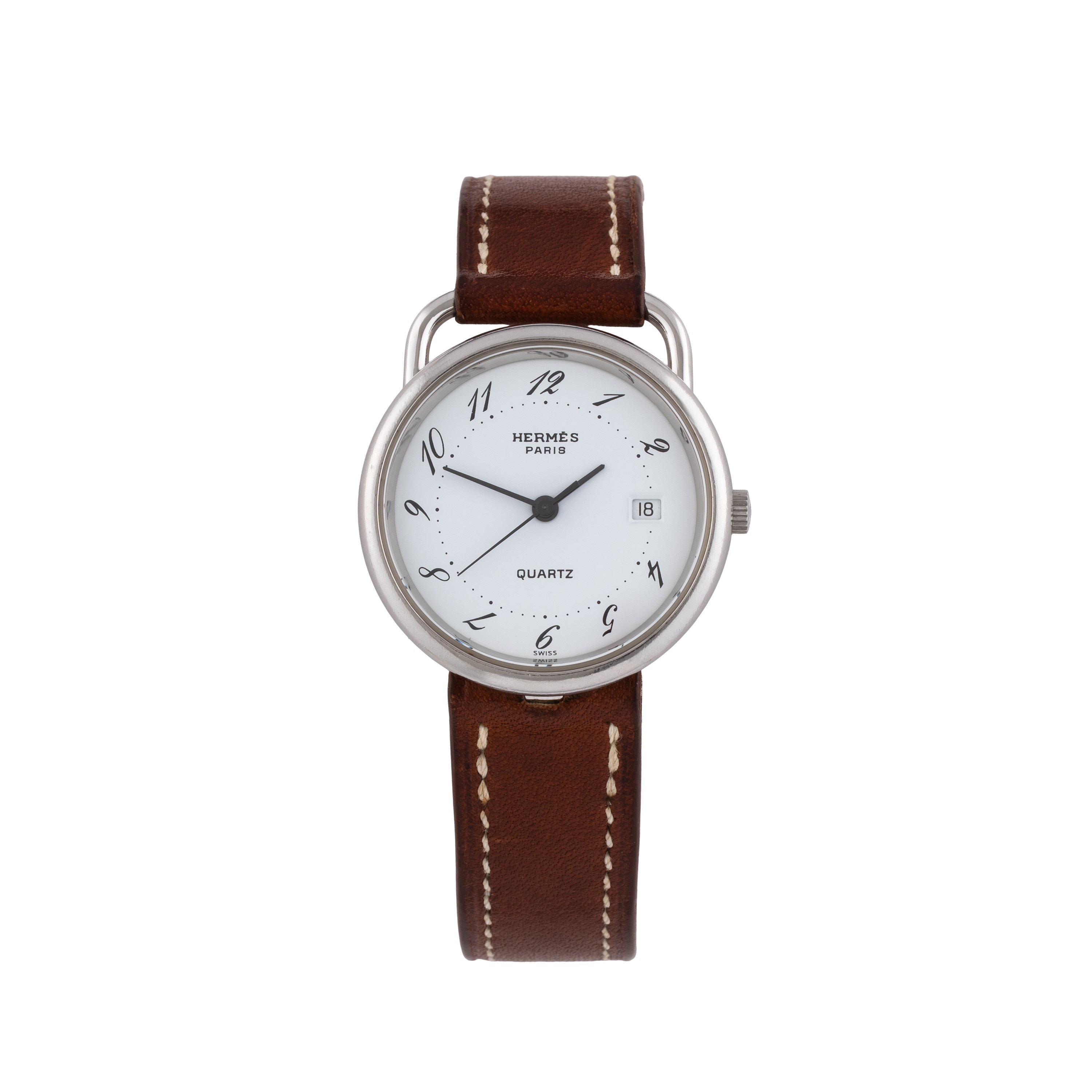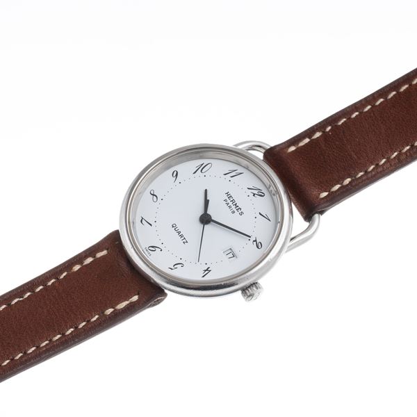 Cinturino in pelle con fibbia in acciaio Hermes. Vetro minerale piatto. Fondello a pressione in acciaio.