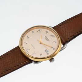 Note: Orologio solo tempo al quarzo in acciaio con ghiera dorata. Quadrante champagne, datario ad ore tre. Sfere a bastone dorate, indici arabi neri. Cinturino e fibbia dorata Hermes. Vetro minerale piatto. Fondello a pressione in acciaio.