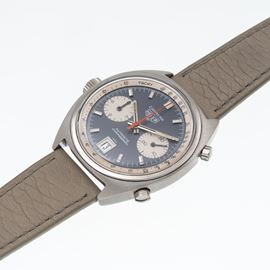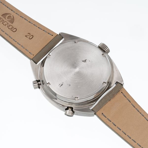 Note: Quadrante blu soleil, ghiera esterna tachimetrica bianca. Contatori cronografici bianchi con indici neri. Indici e sfere a bastone, sfera dei secondi rossa. Datario ad ore sei, pulsanti cronografici ad ore due e ad ore quattro, corona logata ad ore nove. Vetro plexi bombato, fondello a vite.