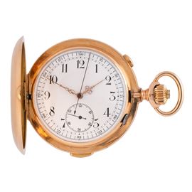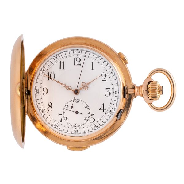 Note: Orologio da tasca cronografo in oro rosa 18 kt ripetizione minuti. Quadrante in porcellana, indici arabi neri, sfere dorate, piccoli secondi ad ore sei. Pulsante cronografico ad ore due, pulsante ripetizione minuti ad ore sei. Vetro plexiglass bombato. Fondello a scatto in oro rosa 18 kt. Peso: g 130.5.