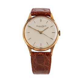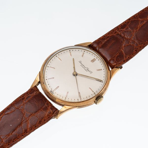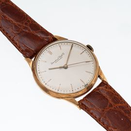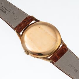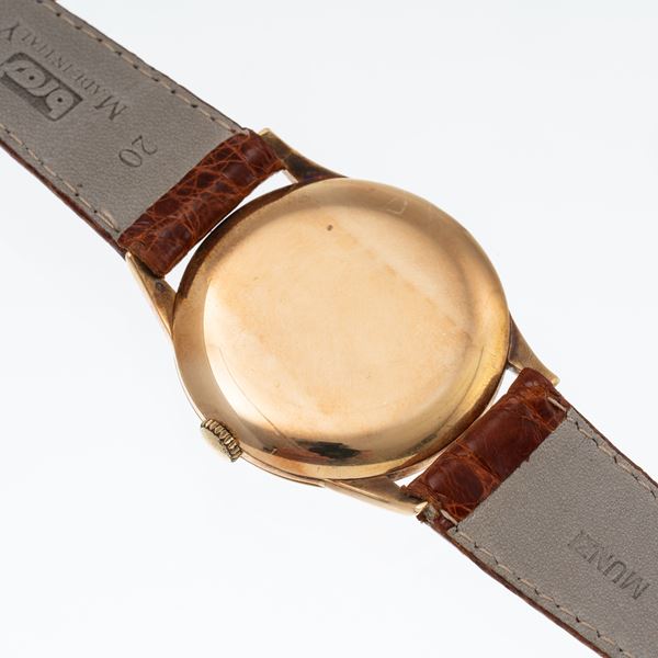 Note: Orologio solo tempo a carica manuale in oro giallo 14 kt. Quadrante argenté, indici e sfere a bastone dorati. Secondi centrali. Cinturino in pelle. Vetro plexiglass bombato. Fondello a pressione in oro 14 kt. Peso testa orologio: 32,4 g. Peso totale: 39,4 g.