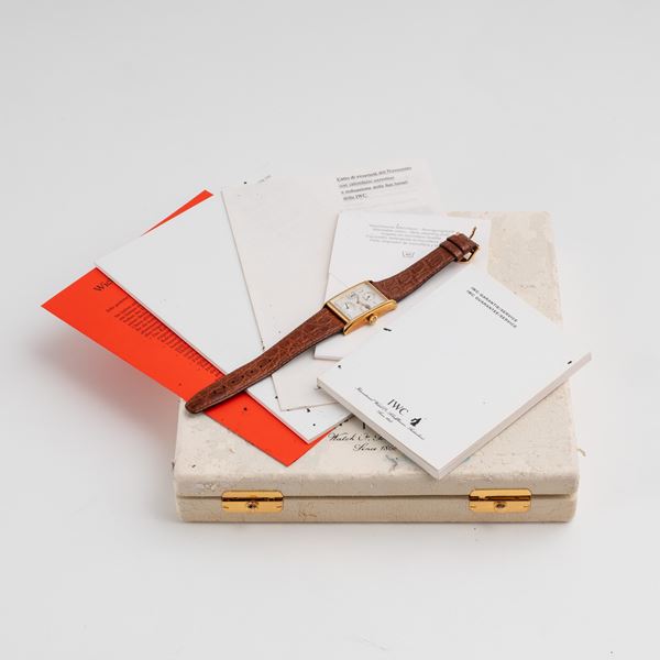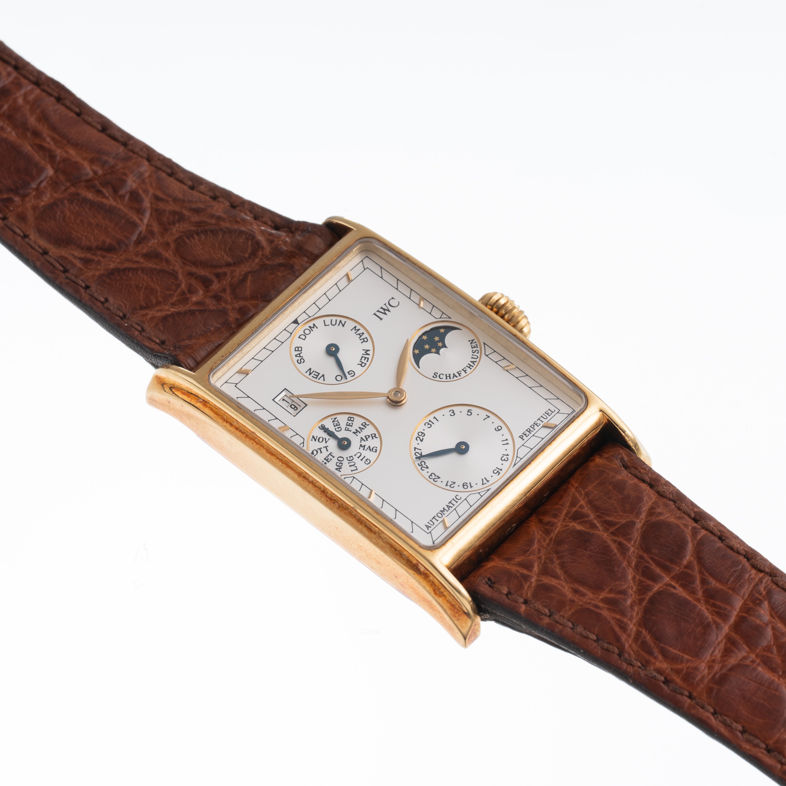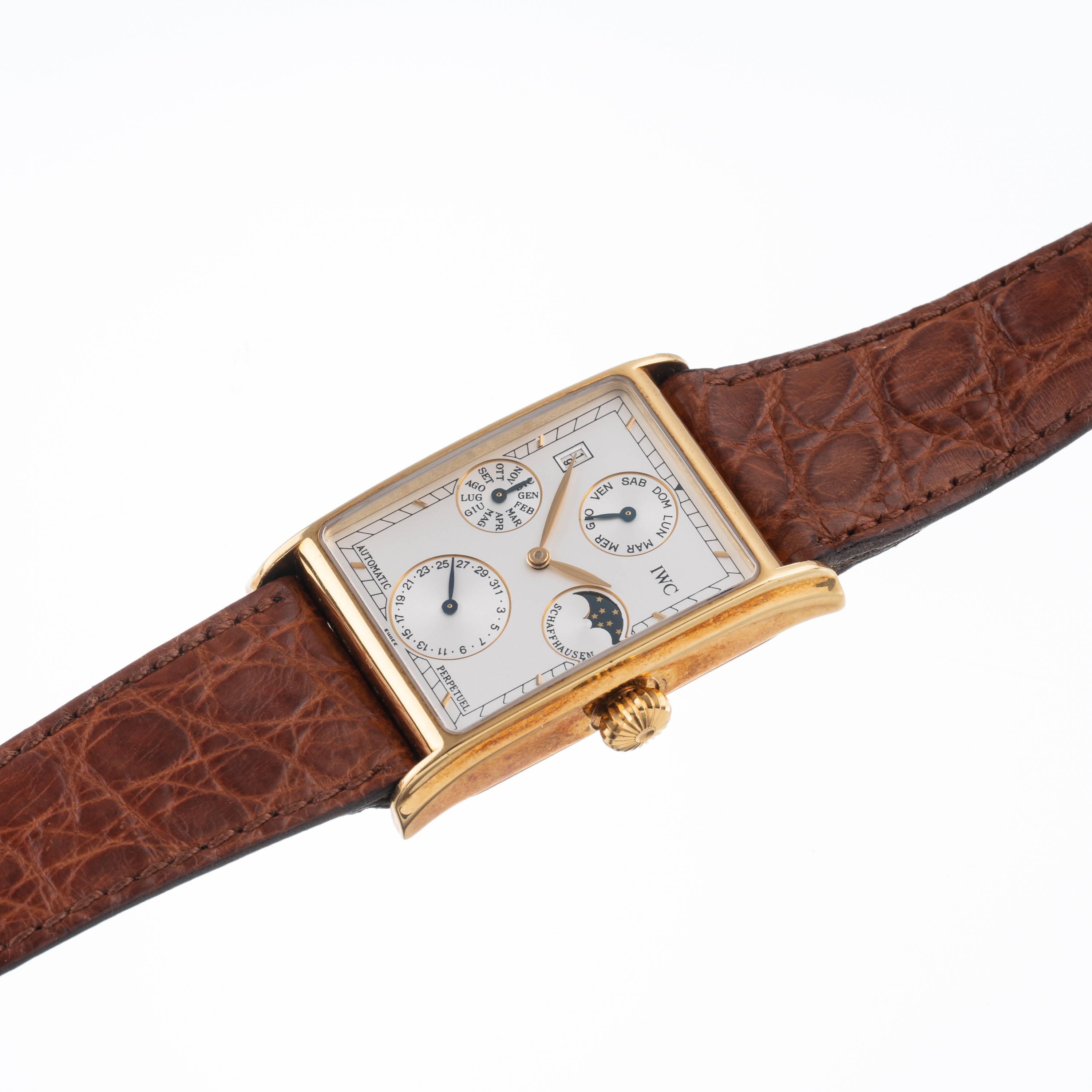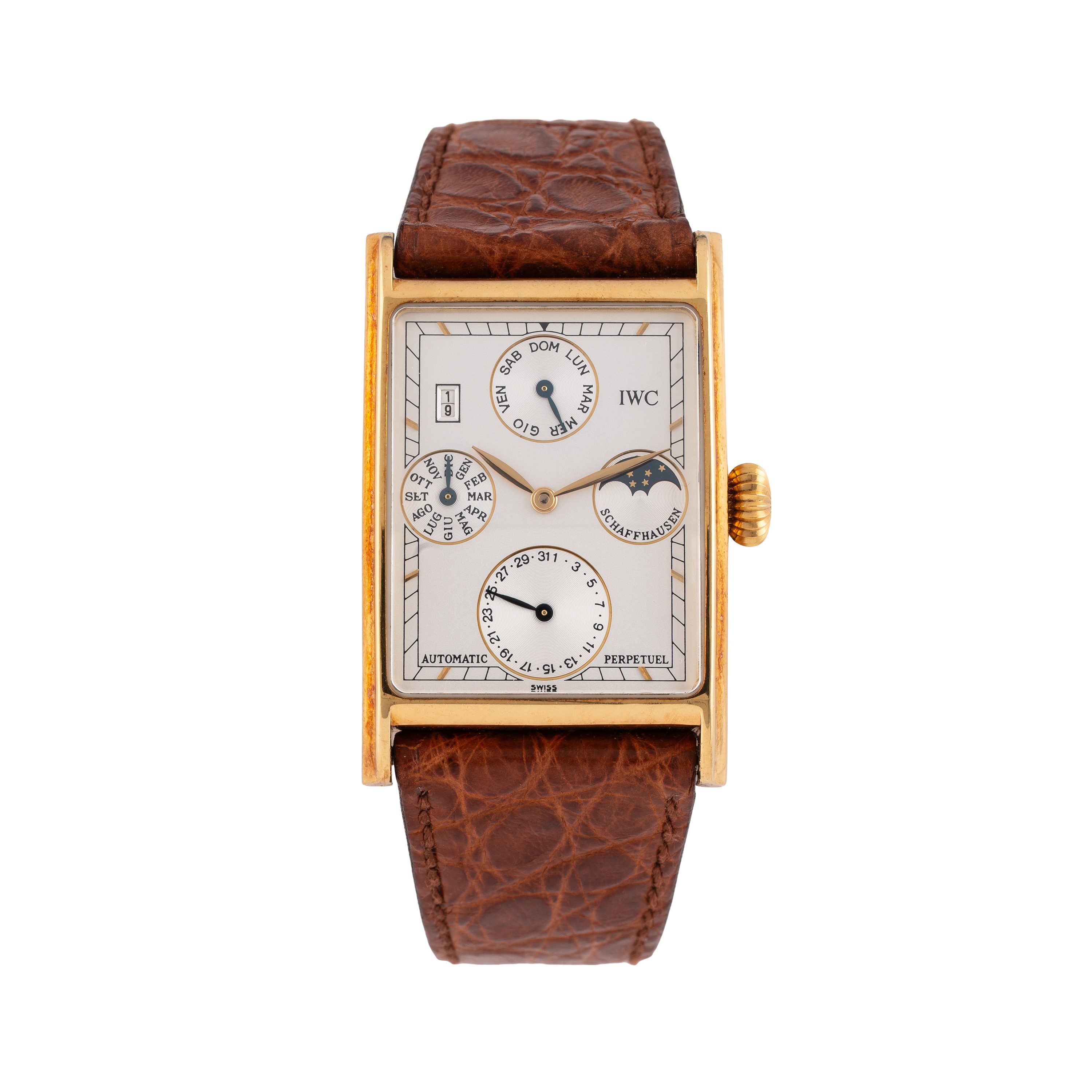 Note: Calendario perpetuo in oro giallo 18 kt a carica automatica. Quadrante argenté. Fasi luna ad ore tre, contatore del giorno ad ore dodici, del mese ad ore nove e della data ad ore sei. Finestra dell'anno ad ore dieci. Sfere a foglia dorate. Cinturino in pelle e fibbia in oro giallo 18 kt IWC. Vetro minerale piatto. Fondello in oro giallo 1 kt. Peso testa orologio: 48,4 g. Peso totale: 58,8 g.