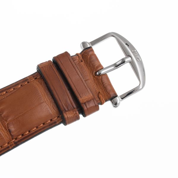 Note: Limited Edition. Orologio solo tempo a carica manuale in acciaio. Quadrante bianco, indici arabi blu e sfere brunite blu. Cinturino in pelle e fibbia in acciaio IWC. Vetro minerale piatto. Fondello a vista in acciaio.