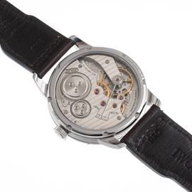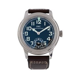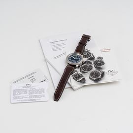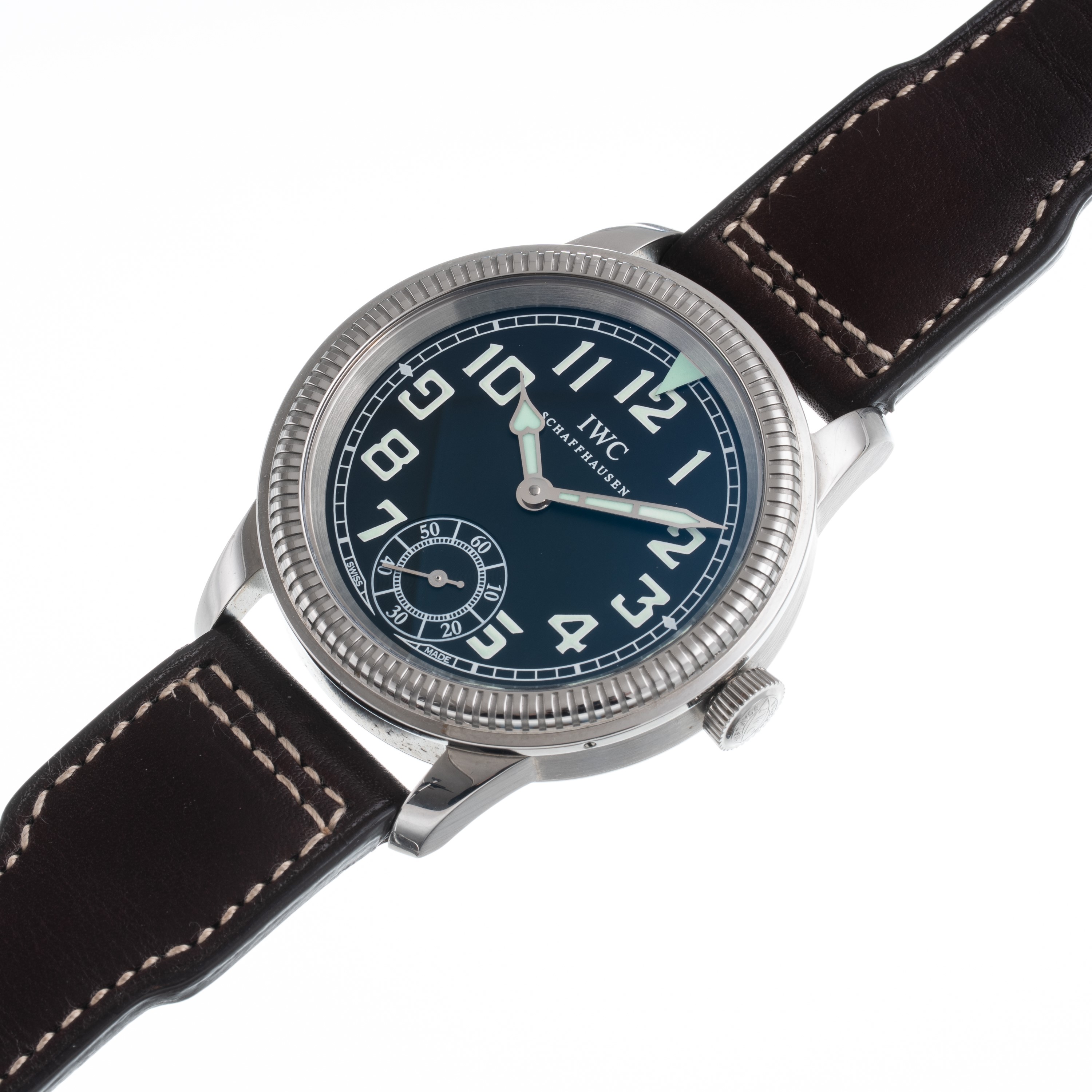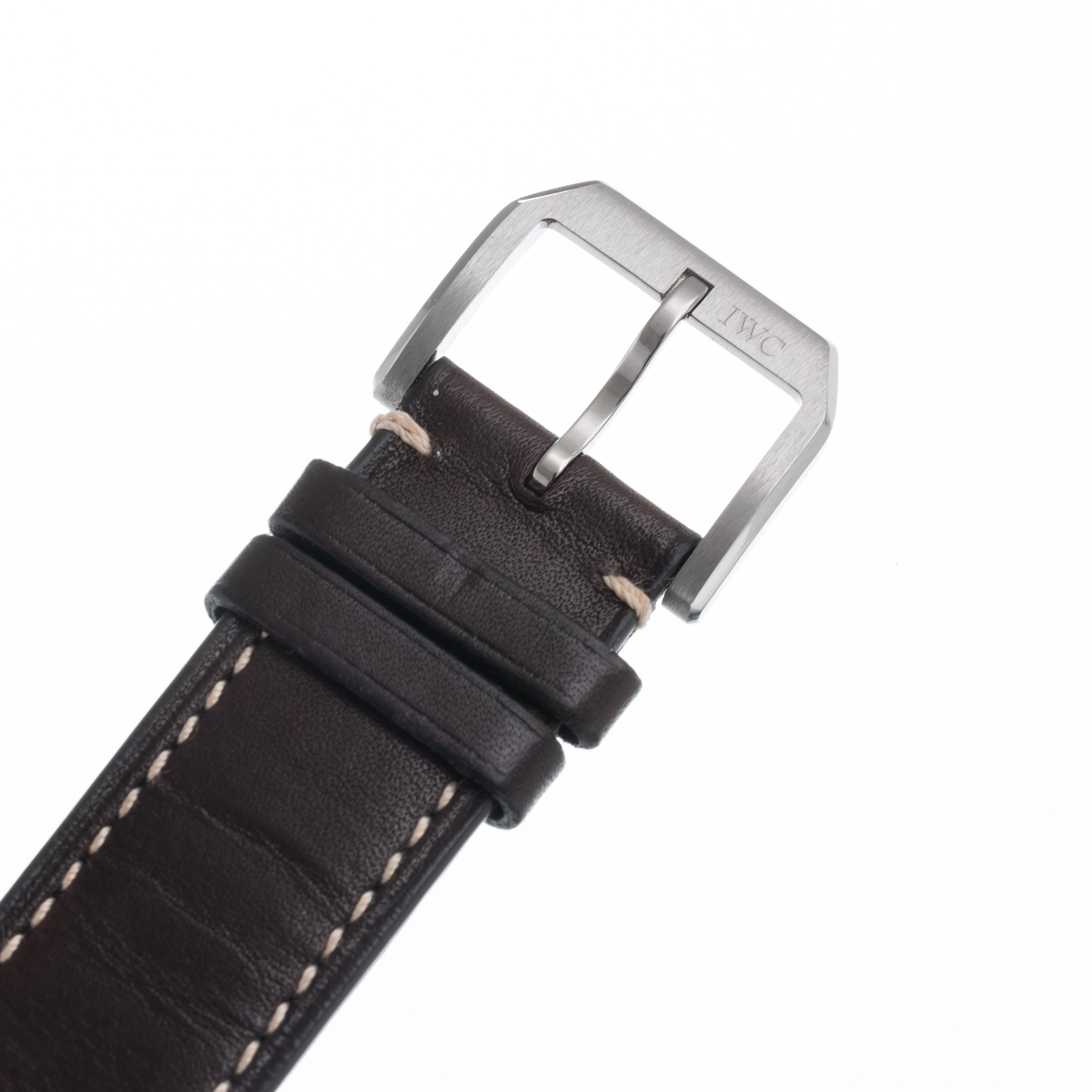 Note: Orologio solo tempo a carica manuale in acciaio. Quadrante nero, indici neri con materiali luminescente, sfere con materiale luminescente. Piccoli secondi ad ore sei. Ghiera bidirezionale. Cinturino in pelle e fibbia in acciaio IWC. Vetro minerale piatto. Fondello a vista in acciaio.
