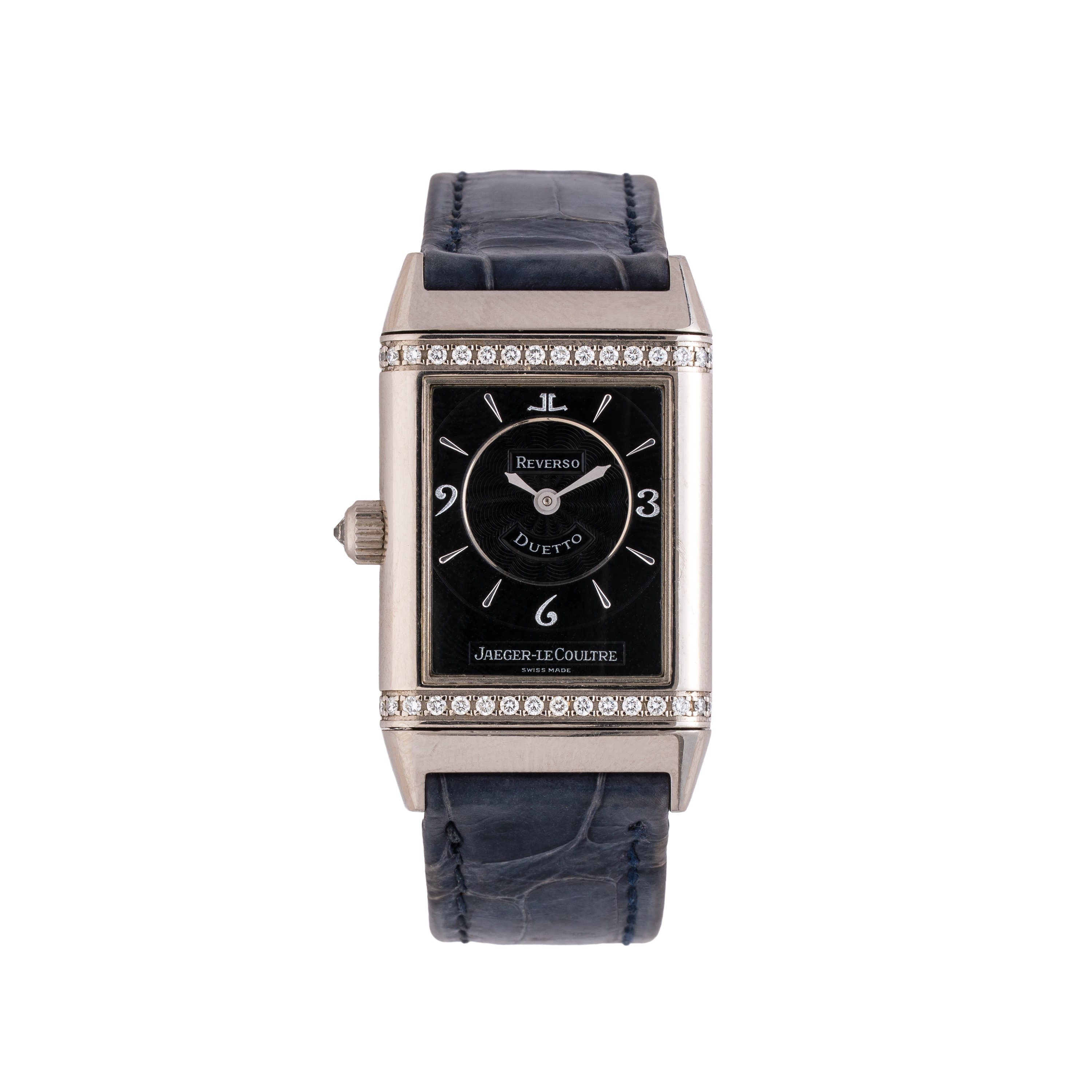 Note: Orologio solo tempo a carica manuale in oro bianco 18 kt reversibile. Doppio quadrante argenté e nero. Ghiera con brillanti nella parte con quadrante nero. Cinturino in pelle Jaeger LeCoultre. Deployante in oro bianco 18 kt Jaeger Le Coultre. Vetro curvo minerale. Peso testa orologio: 52,9 g. Peso totale: 71,7 g.