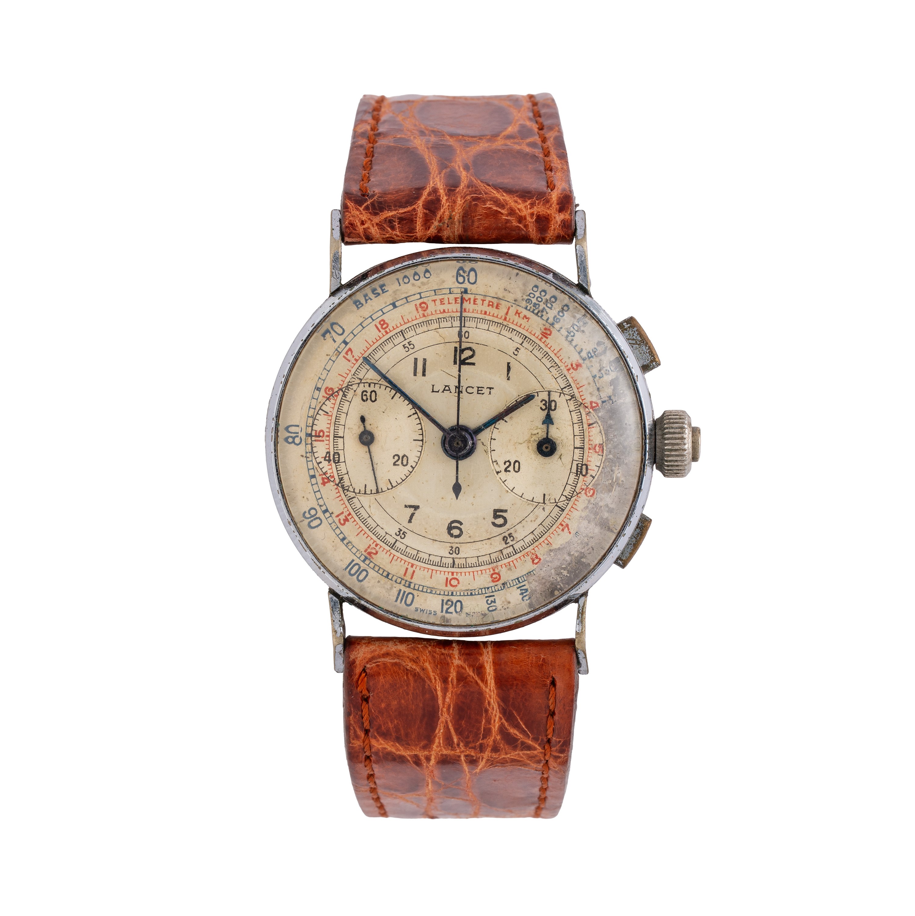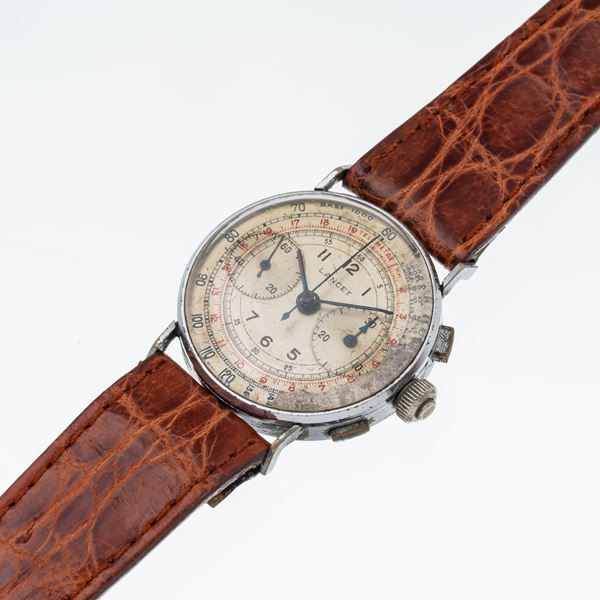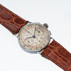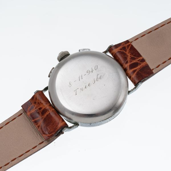 Note: Cronografo a carica manuale placcato ad anse fisse. Quadrante bitonale con scala telemetrica rossa e tachimetrica blu. Pulsante del reset cronografico sulla corona. Indici romani neri. Sfere a bastone brunite blu. Contatore dei secondi ad ore nove e dei minuti ad ore tre. Cinturino in pelle. Vetro plexiglass bombato. Fondello a pressione in acciaio.