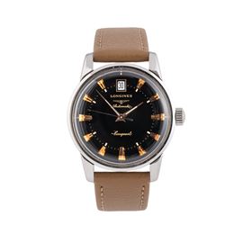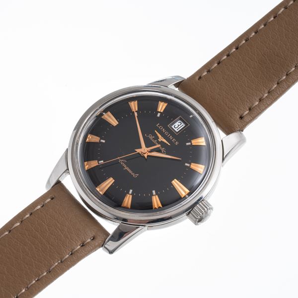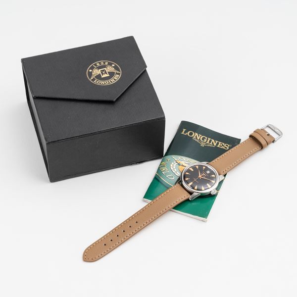 Note: Orologio solo tempo a carica automatica in acciaio. Quadrante nero. Datario ad ore dodici. Sfere dauphine con materiale luminescente. Cinturino in pelle. Fibbia in acciaio Longines. Vetro plexiglass bombato. Fondello a vite in acciaio con logo smaltato.