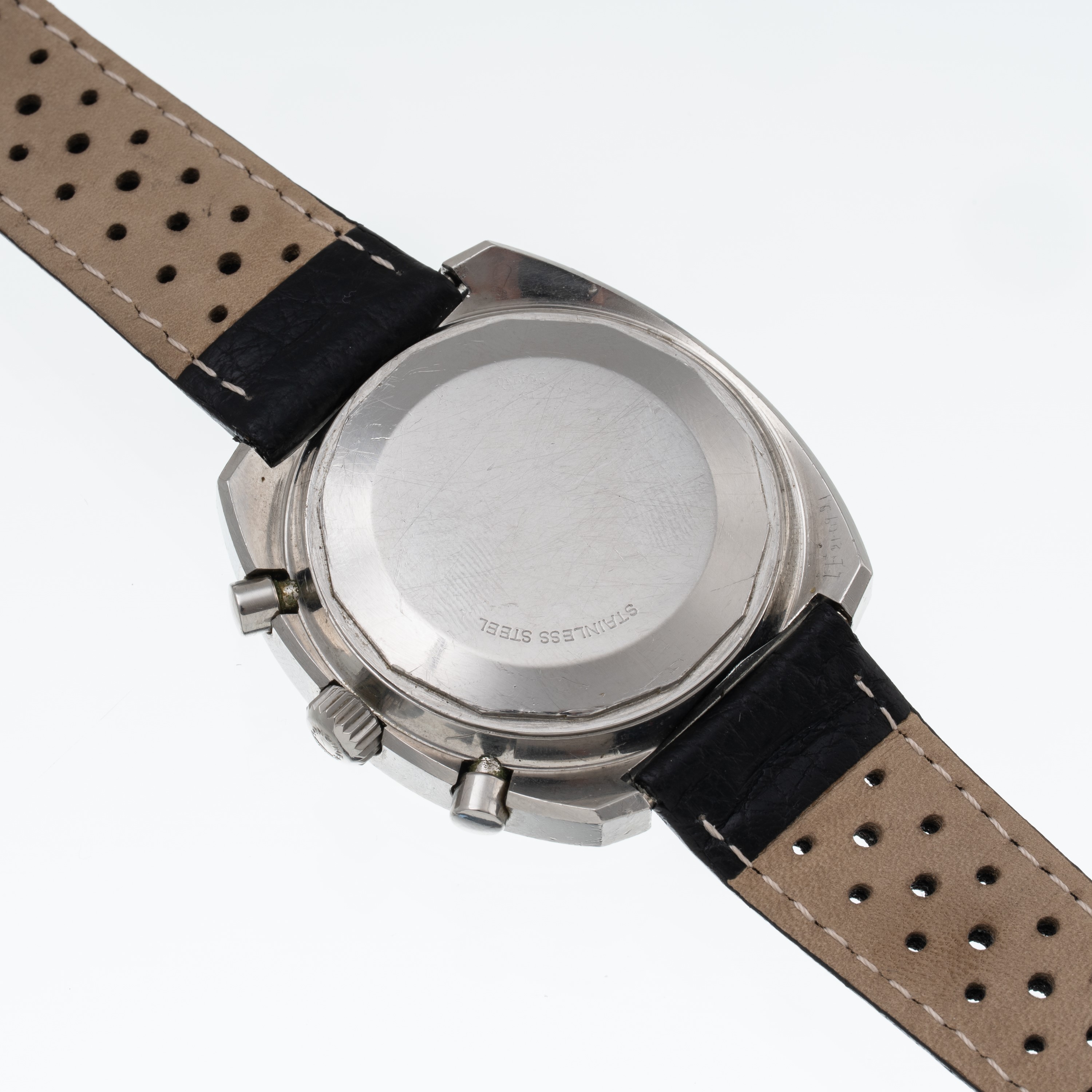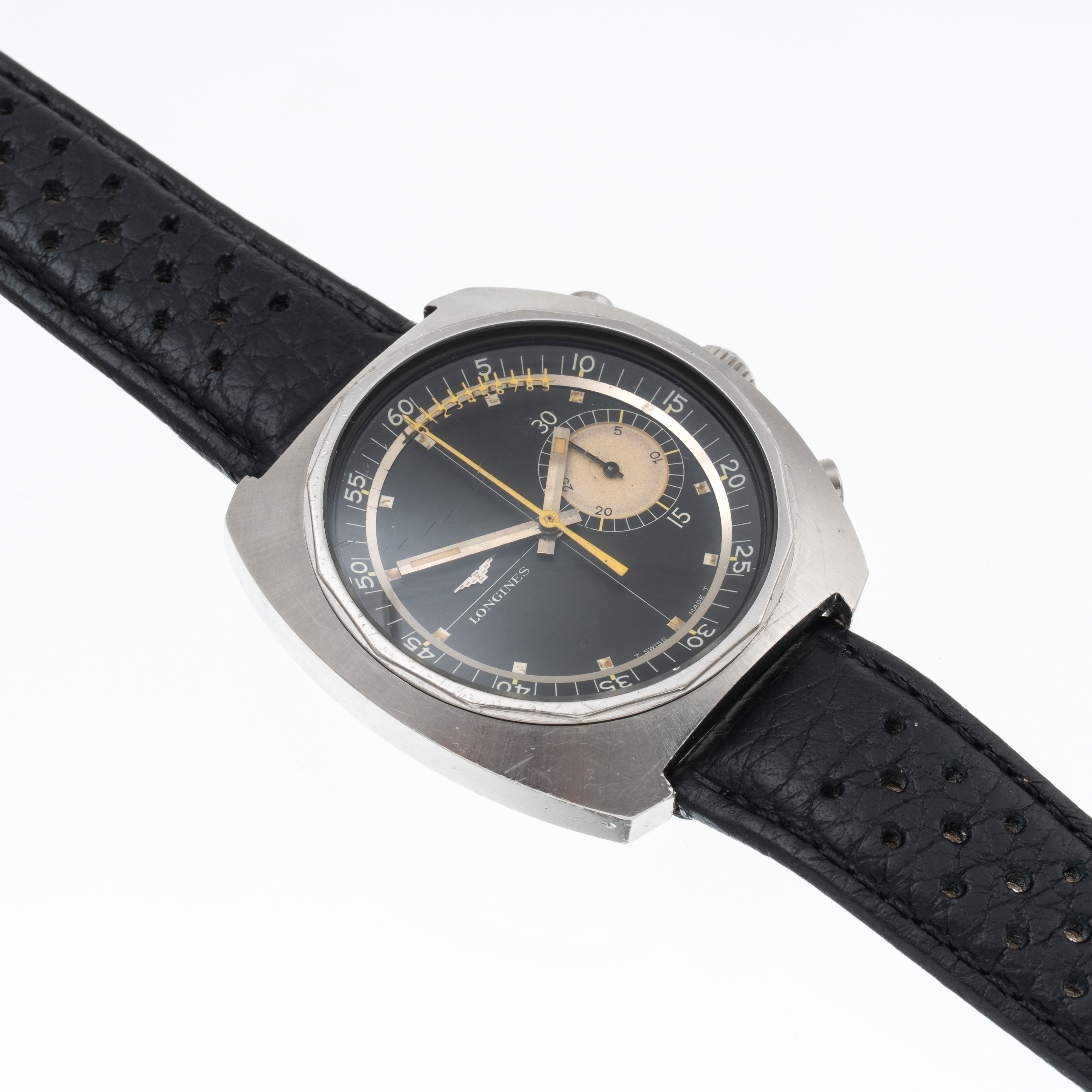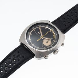 Note: Cronografo a carica manuale in acciaio. Quadrante nero, sfere a bastone con materiale luminescente. Sfera cronografica gialla con scala decimale. Contatore dei minuti ad ore tre. Cinturino in pelle. Vetro minerale bombato. Fondello a vite in acciaio.