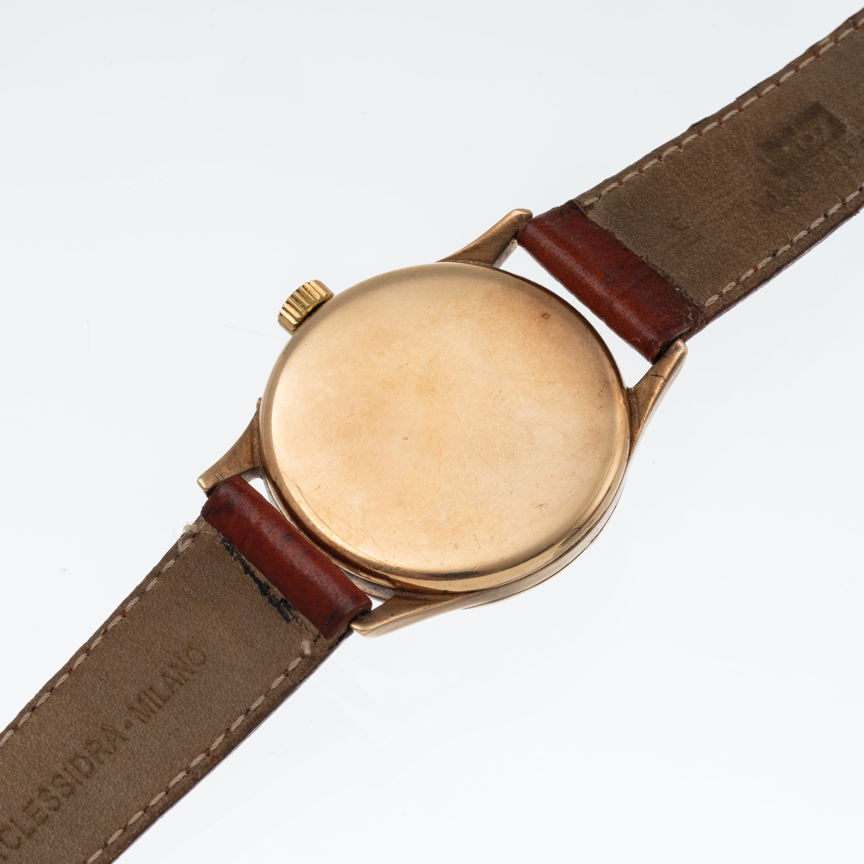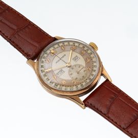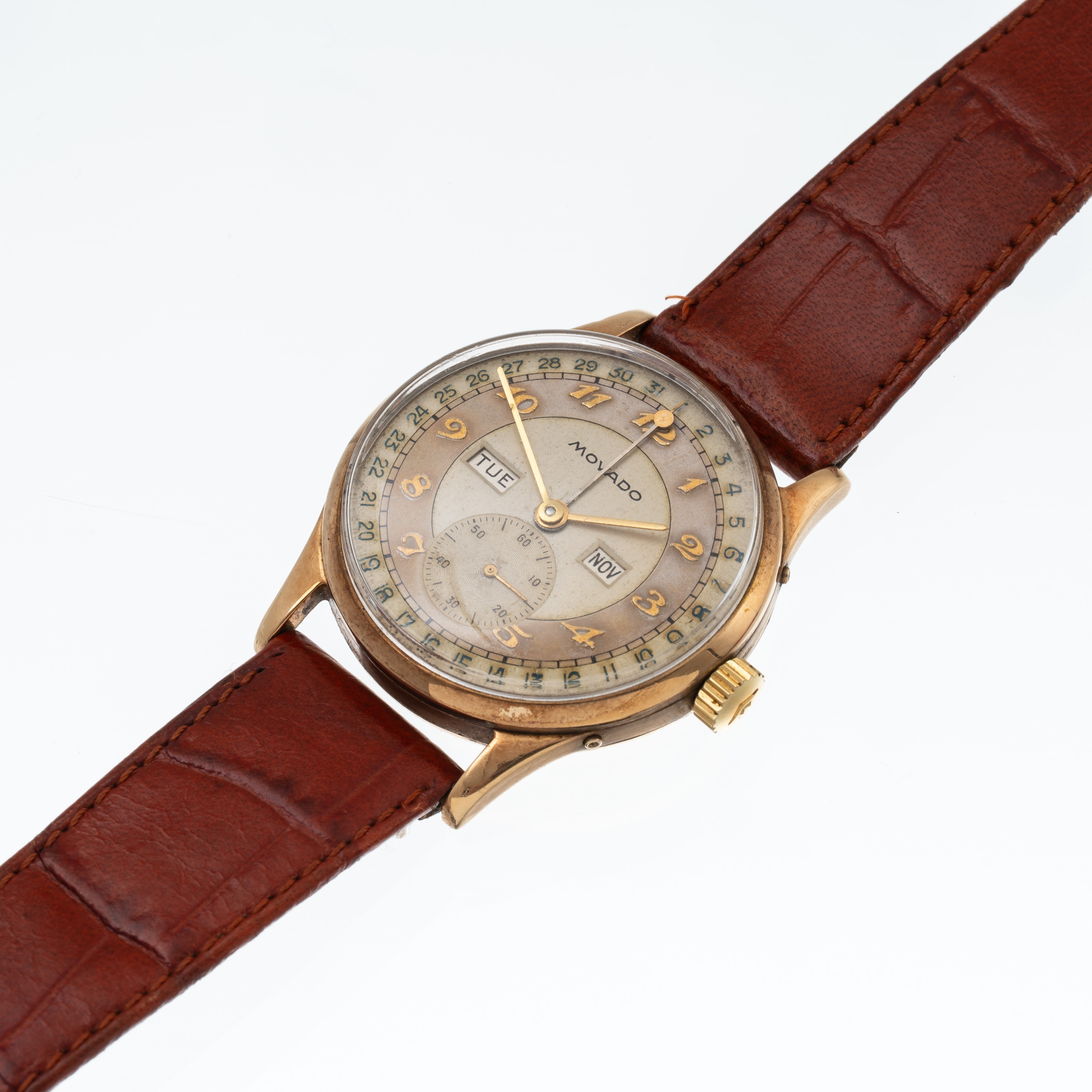 Note: Orologio triplo calendario a carica manuale in oro giallo 9 kt. Cassa realizzata da A.L.Dennision per il mercato inglese. Quadrante bitonale, indici breguet, sfere a bastone dorate, freccino del datario, numeri del datario arabi blu. Disco data e del mese in inglese. Corona logata Movado. Vetro plexiglas bombato. Fondello a pressione in oro giallo 9 kt. Peso testa orologio: 36,2 g. Peso totale: 42,6 g.