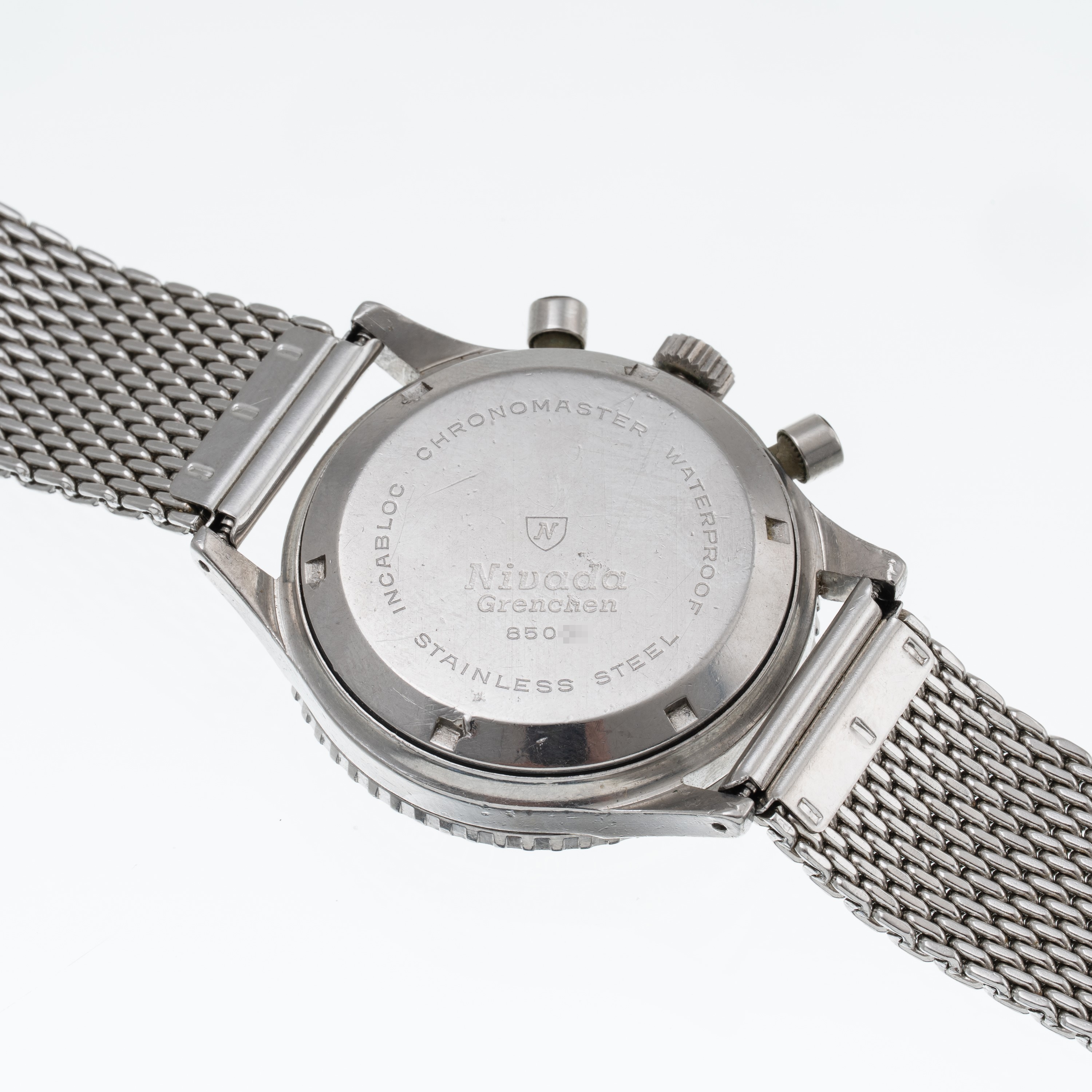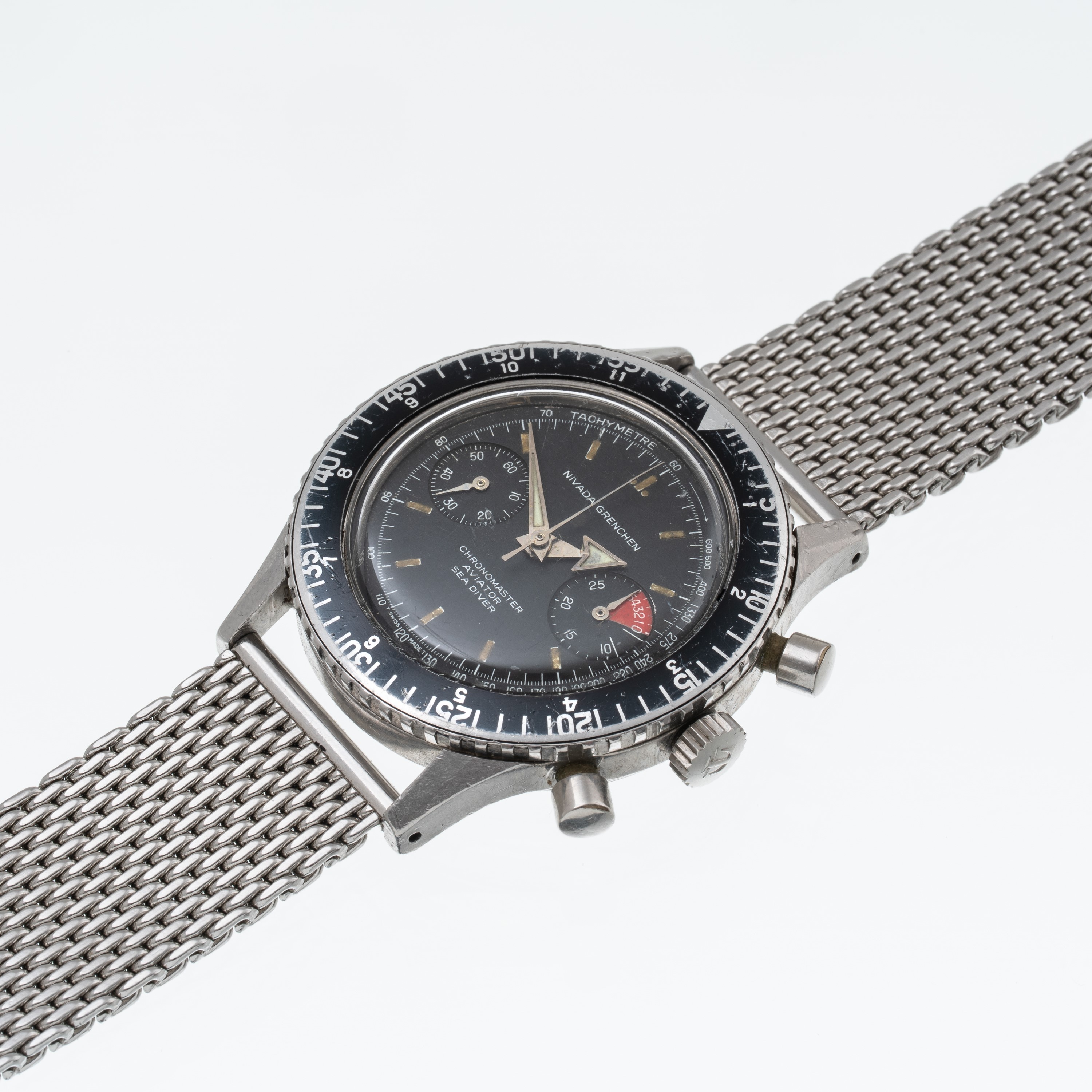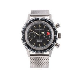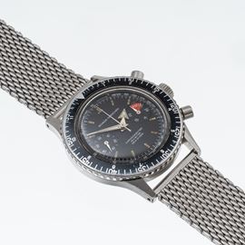 Note: Cronografo a carica manuale in acciaio. Quadrante nero con scala tachimetrica nera, indici a bastone e sfere a gladio con materiale luminescente. Contatore dei secondi ad ore nove e dei minuti ad ore tre. Ghiera bidirezionale con inserto nero con numeri arabi. Bracciale in acciaio. Vetro plexglass bombato. Fondello a vite in acciaio.