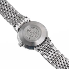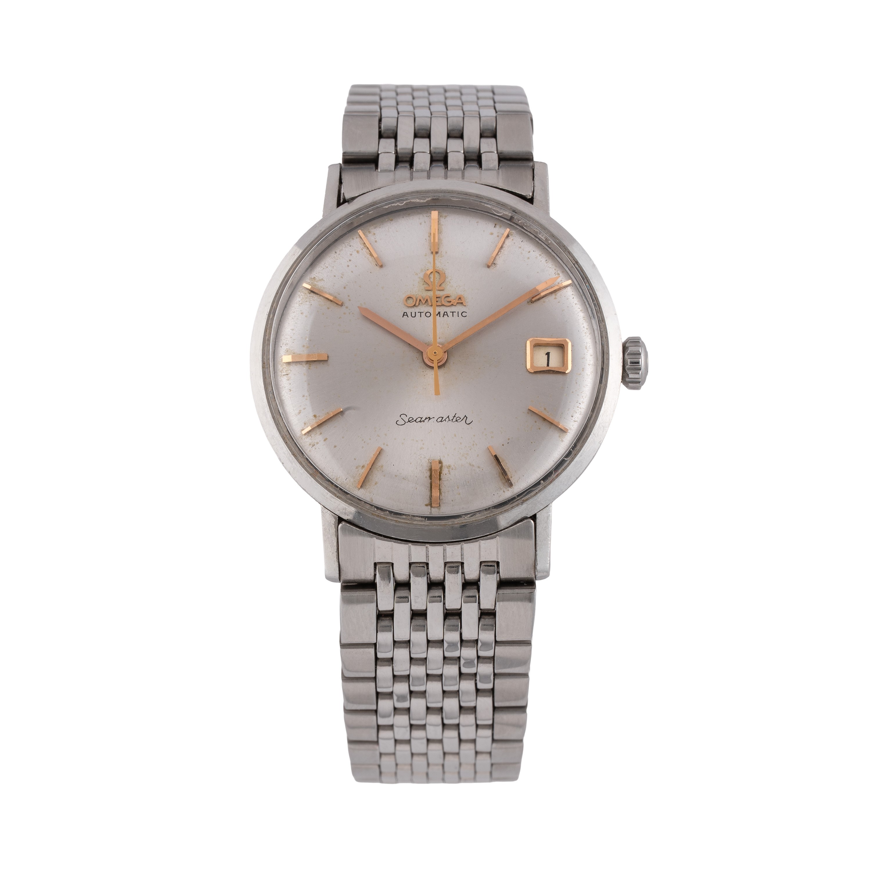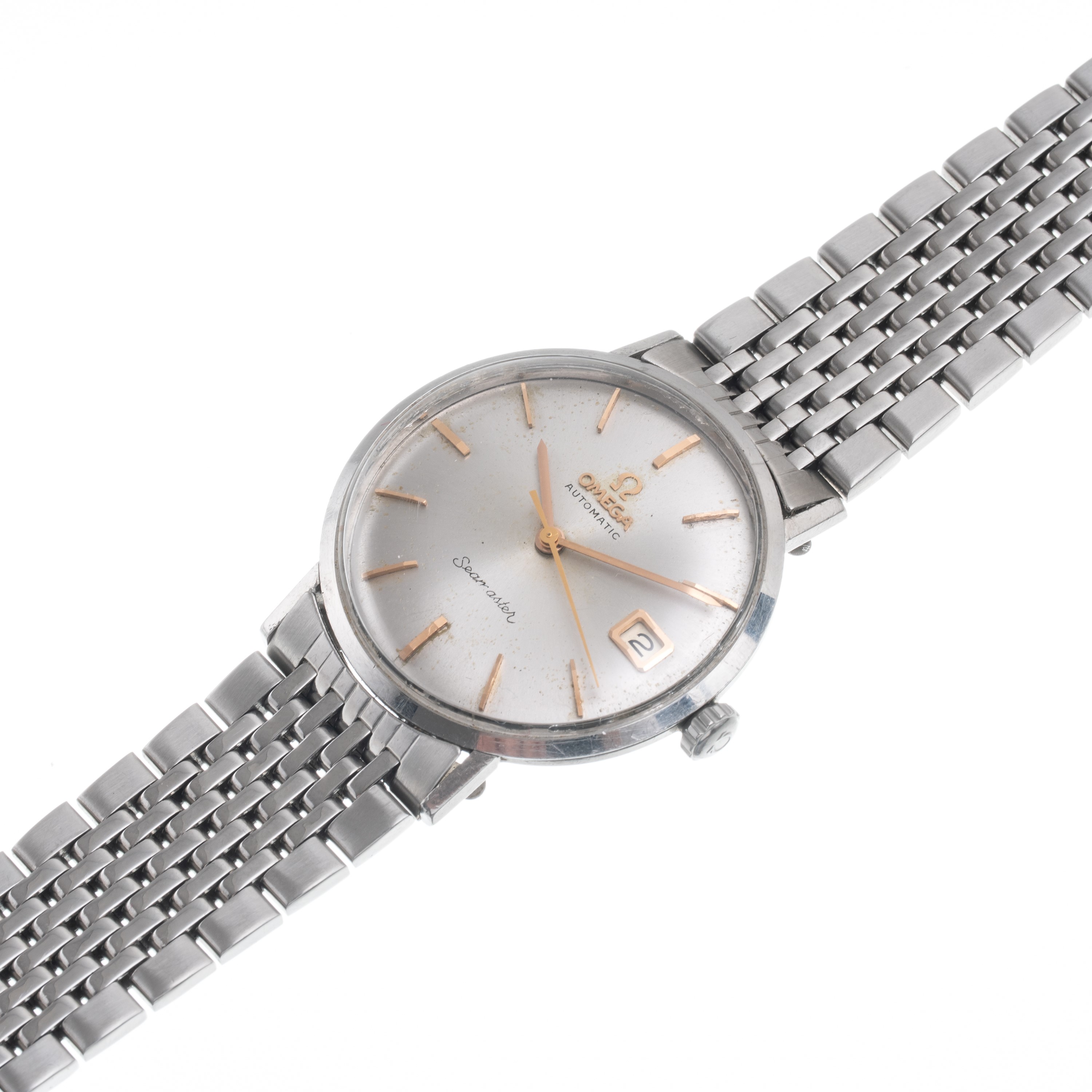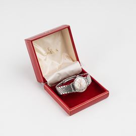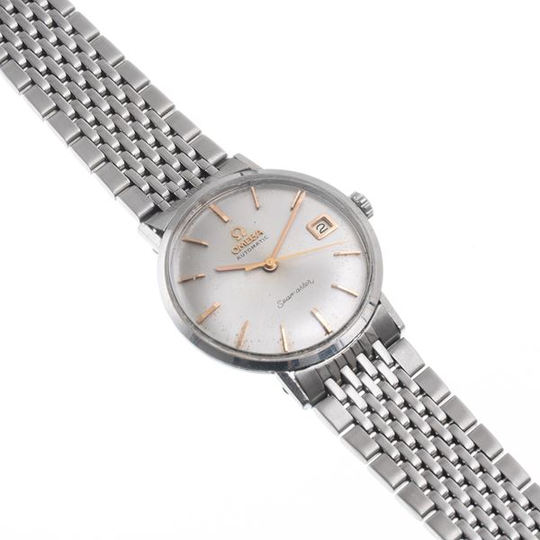 Note: Orologio solo tempo a carica automatica in acciaio. Quadrante argnenté, indici e sfere a bastone dorati. Bracciale in acciaio Omega. Vetro plexiglass bombato. Cassa monoblocco in acciaio.