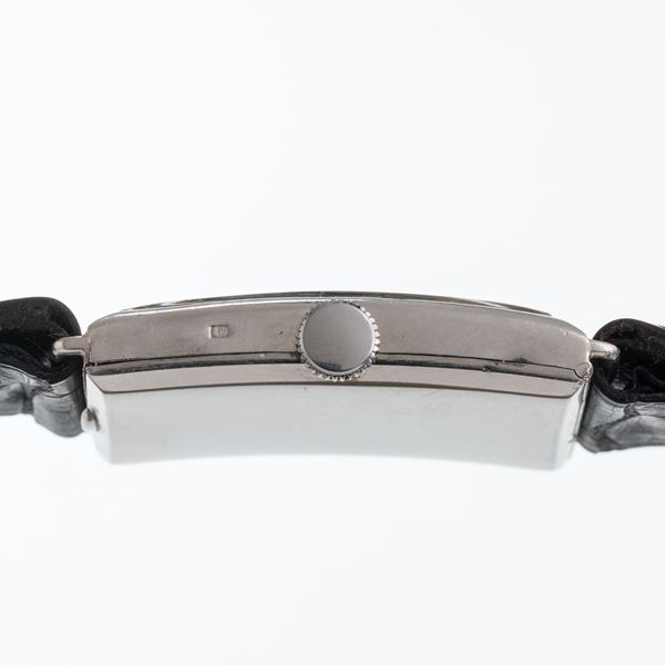 Note: Orologio solo tempo a carica manuale. Cassa in platino punzone di Mascaron, anse fisse. Quadrante bitonale, indici breguet neri, sfere brunite blu breguet. Piccoli secondi ad ore sei. Cinturino in pelle. Vetro minerale curvo. Fondello a cerniera in platino.