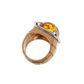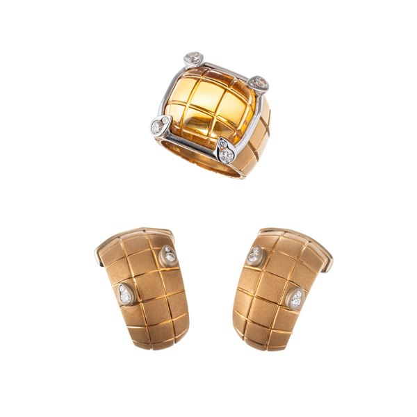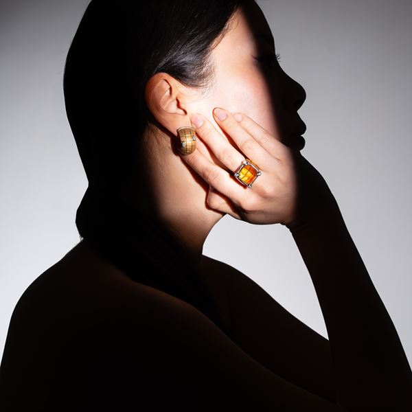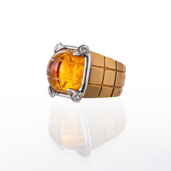Paroure in oro giallo satinato 18 kt, composta da anello di g 25,10 con quarzo citrino cabochon scanalato di mm 1 ct 15,5x16,5 e diamanti taglio brillante, per stimati ct 0,40. Dimensioni: 20x23 mm, misura: 55/15, peso: g 25,10.