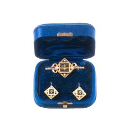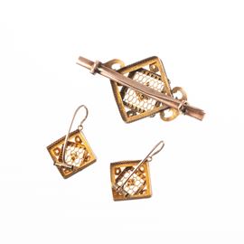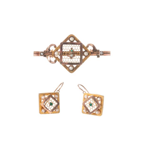 Paroure, orecchini e spilla in oro 9 kt, con perline e smeraldini. Misure: spilla di 5,50x2,70 cm, orecchini di 2,00x2,00 cm. Peso totale: g 7,70.